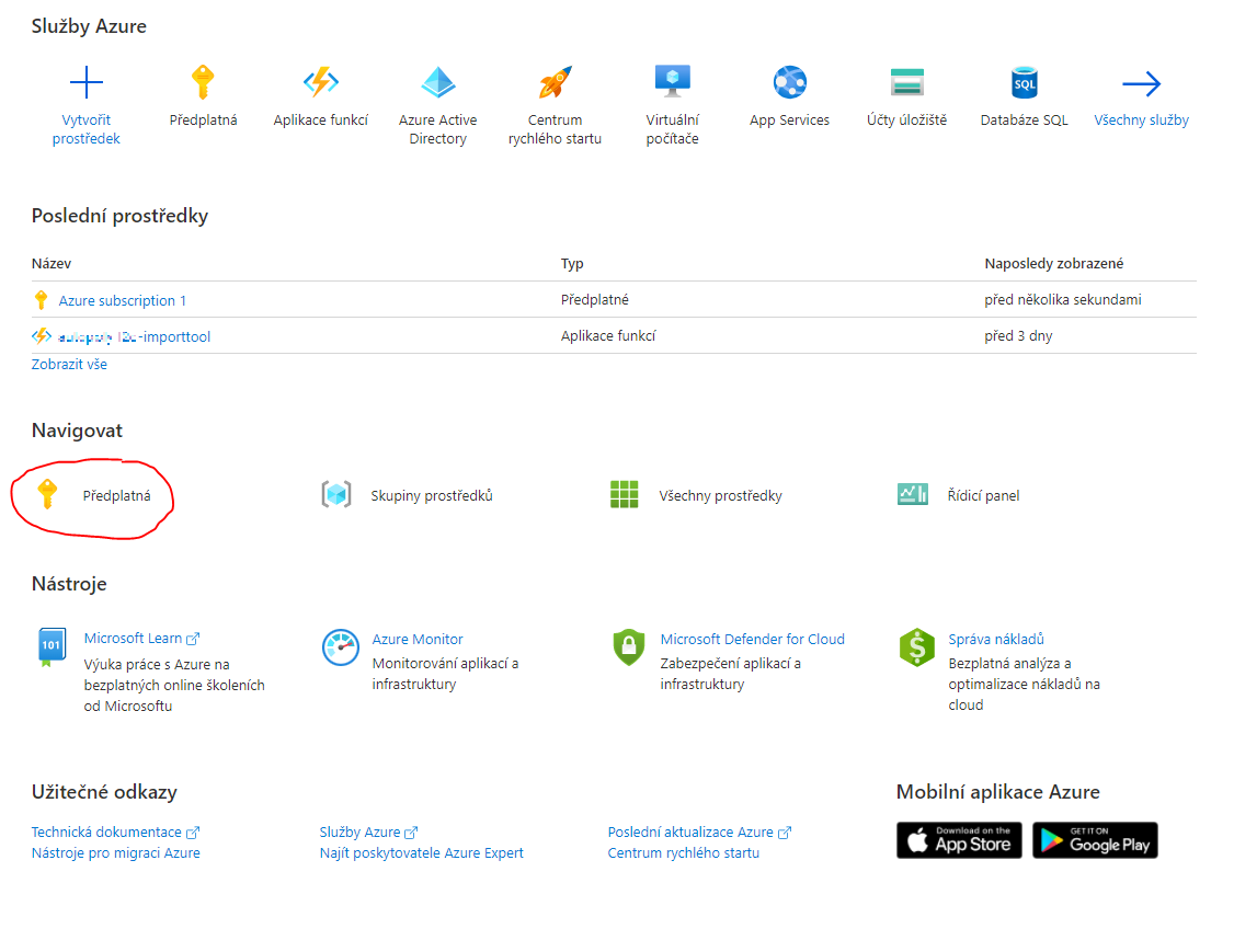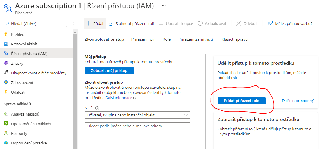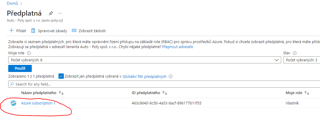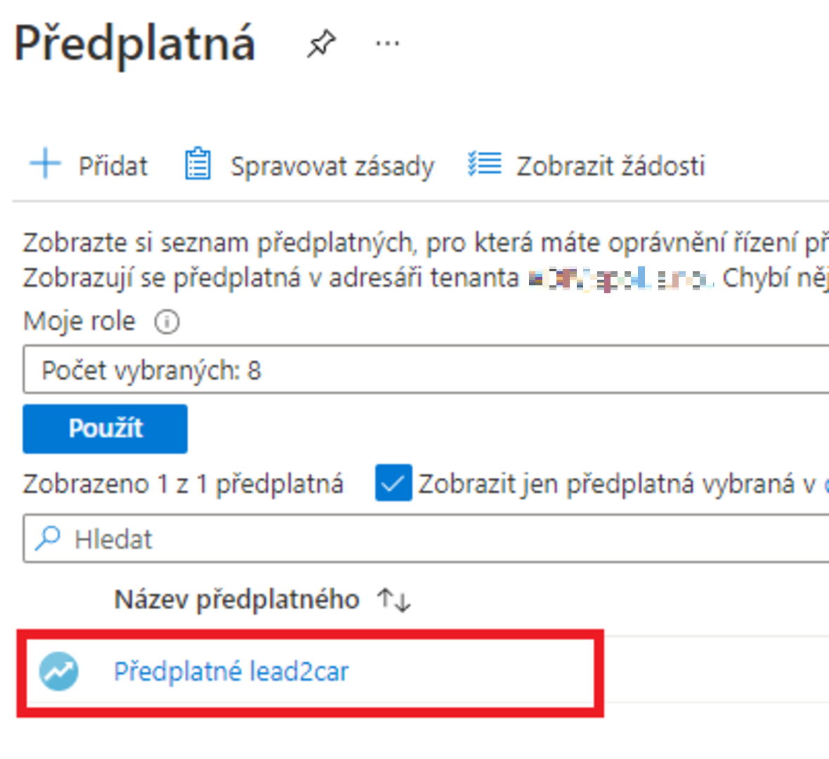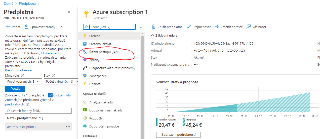 Opět se provádí v azure portálu. Nejprve zvolte možnost Předplatná (pokud možnost přímo nevidíte, tak použijte vyhledávač). Následněte klikněte na vaše Azure subcription.