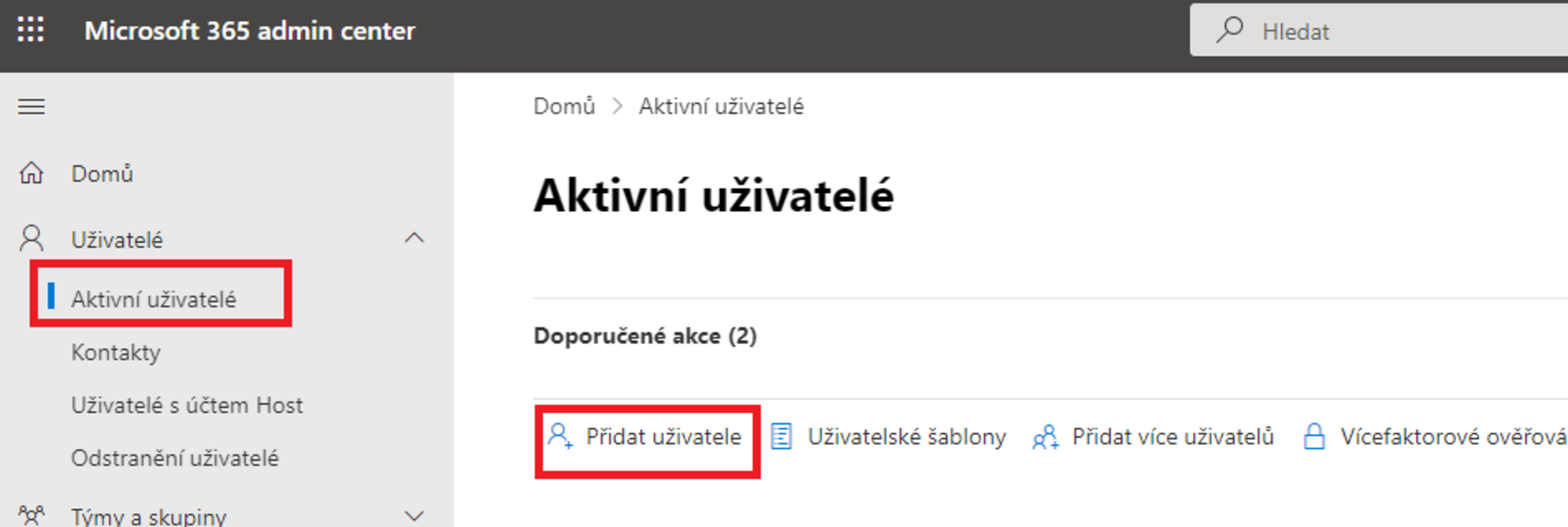Uživatelé se vytváří v portálu admin.microsoft.com. Zde klikněte na Aktivní uživatelé a následně na Přidat uživatele.