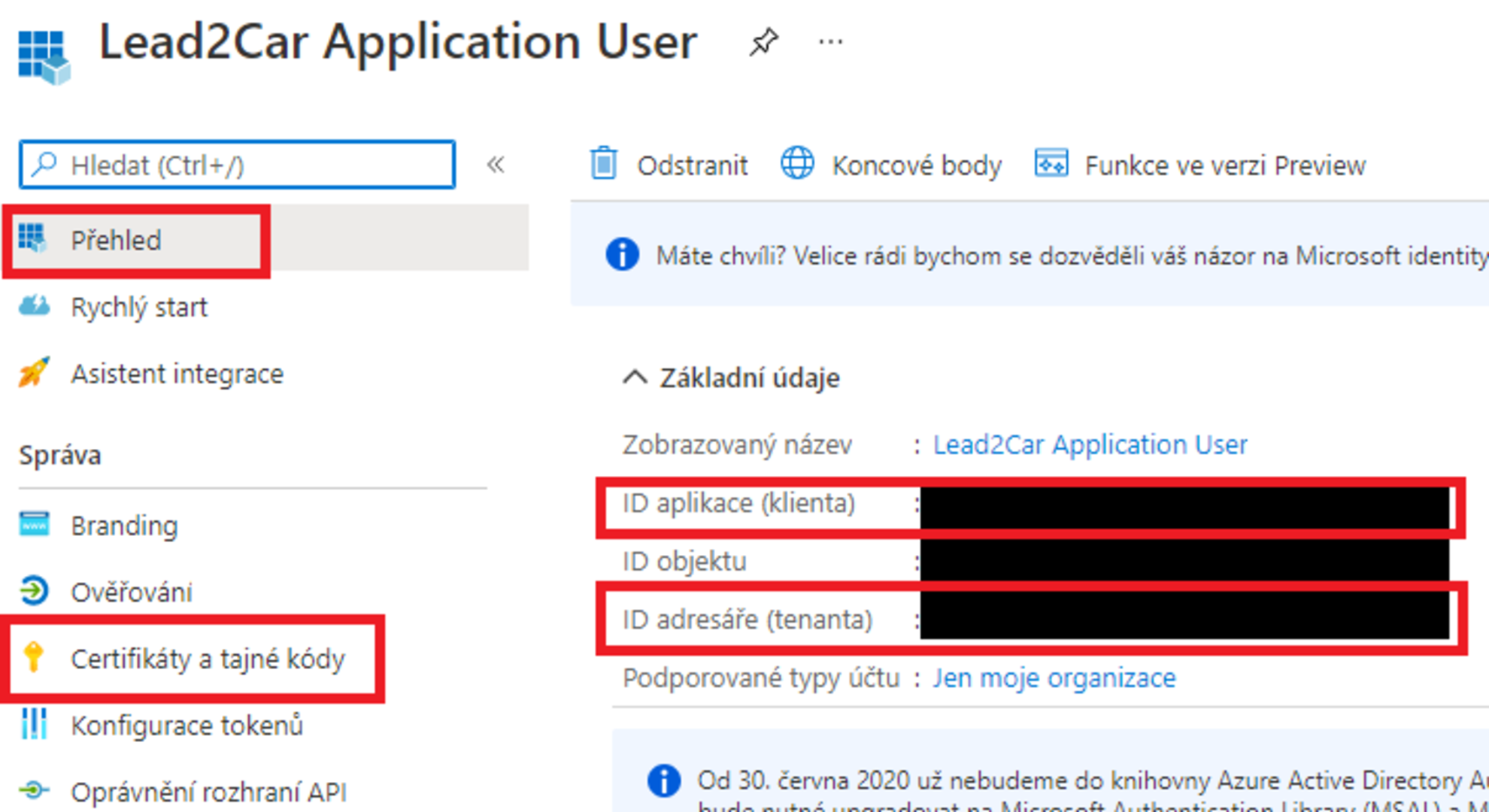 Z přehledu vytvořeného aplikačního uživatele si vykopírujte a někam uložte ID aplikace a ID adresáře. Tyto identifikátory budeme potřebovat. Následně klikněte na možnost Certifikáty a tajné kódy.