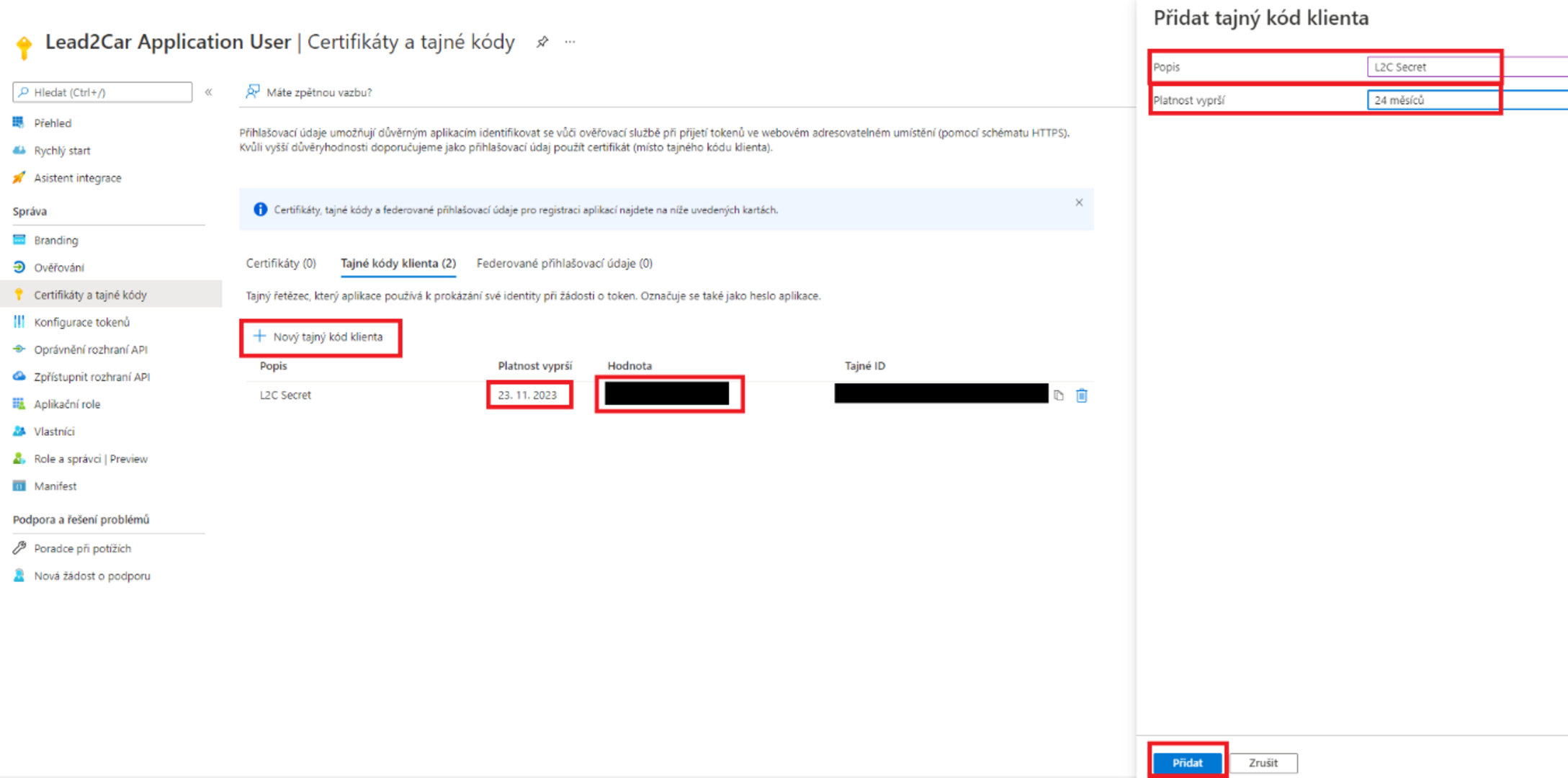 Zde klikněte na možnost Nový tajný kód klienta. Zadejte popis L2C Secret a platnost 24 měsíců. Následně klikněte na tlačítka přidat. Tento tajný kód se vám zobrazí na příslušné stránce. Nyní je potřeba si vykopírovat a někam uložit Hodnotu a Platnost. Tyto identifikátory budeme potřebovat. Hodnotu je nutné vykopírovat ihned! Po opuštění stránky a opětovném návratu na stránku již v políčku hodnota uvidíte jen hvězdičky.
