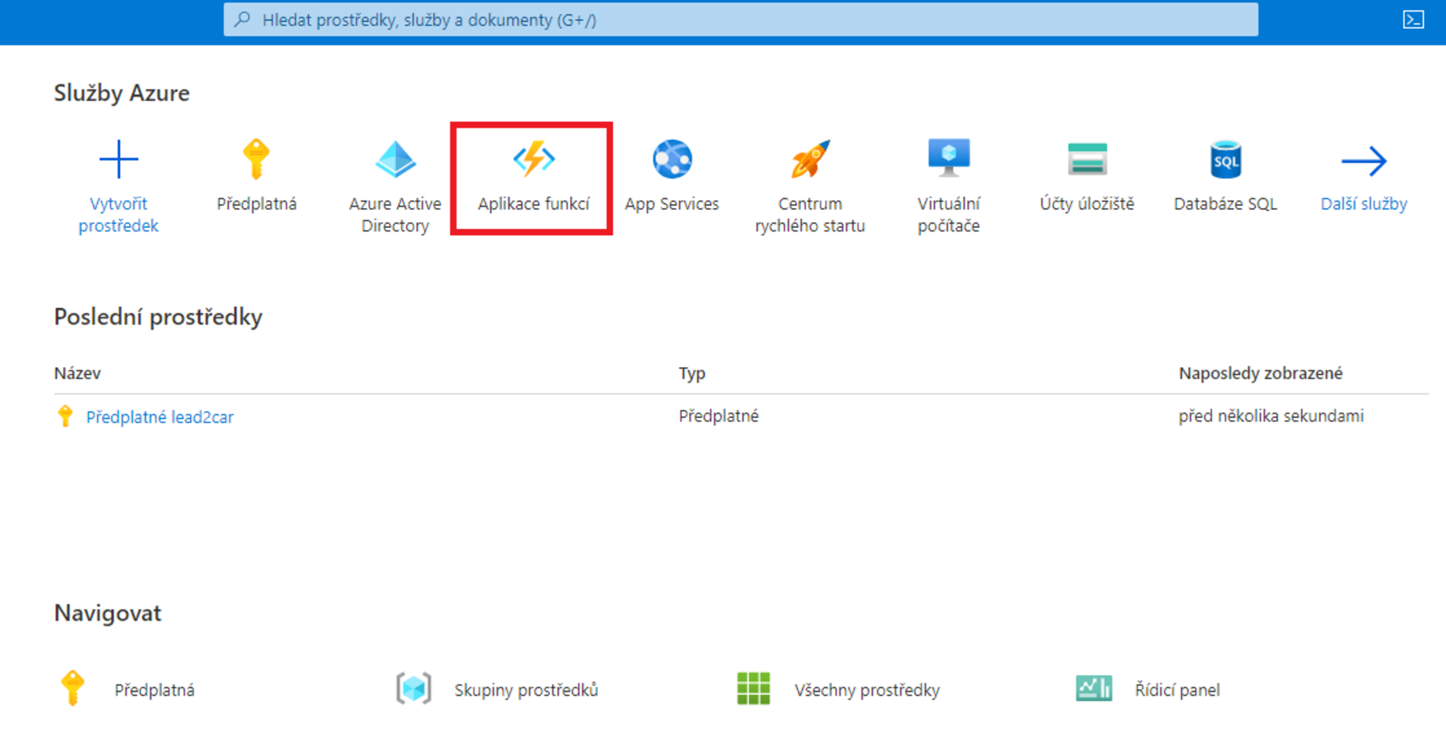 Opět se provádí v azure portálu. Nejprve zvolte možnost Aplikace funkcí (pokud možnost přímo nevidíte, tak použijte vyhledávač). Následně zvolte možnost Vytvořit.