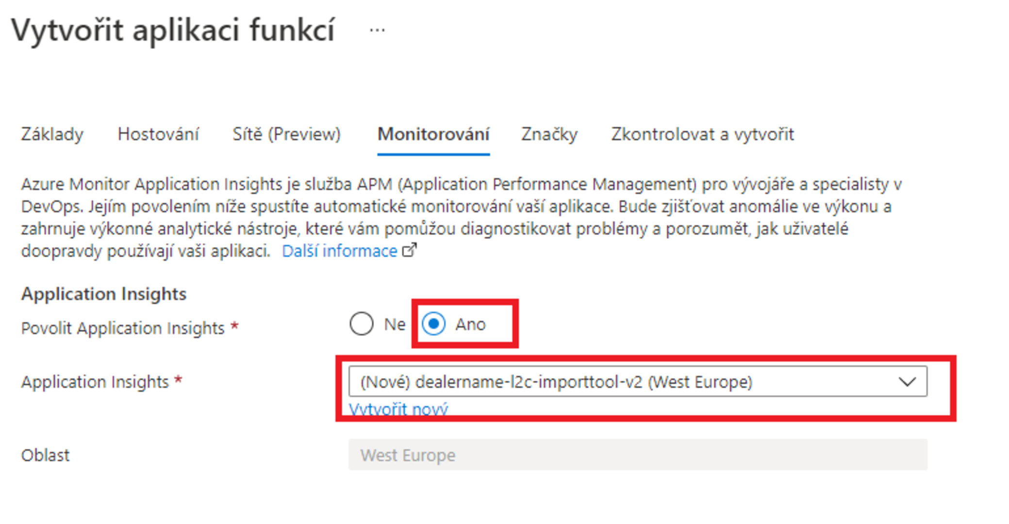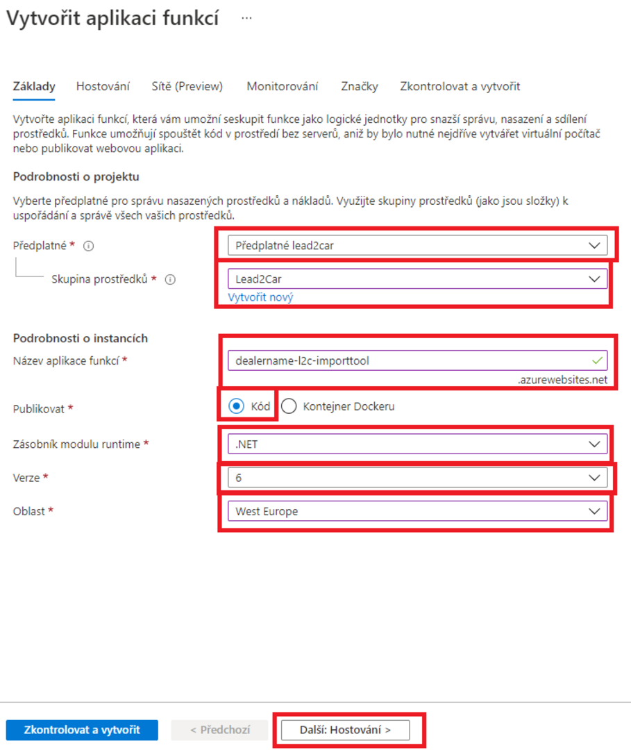 Následující obrazovku vyplňte podle obrázku níže. Zvolte již vytvořené předplatné. Skupinu prostředků budete muset vytvořit novou. V poli Název aplikace funkcí vyplňte místo dealername název vašeho dealerství. Následně klikněte na tlačítko Další.