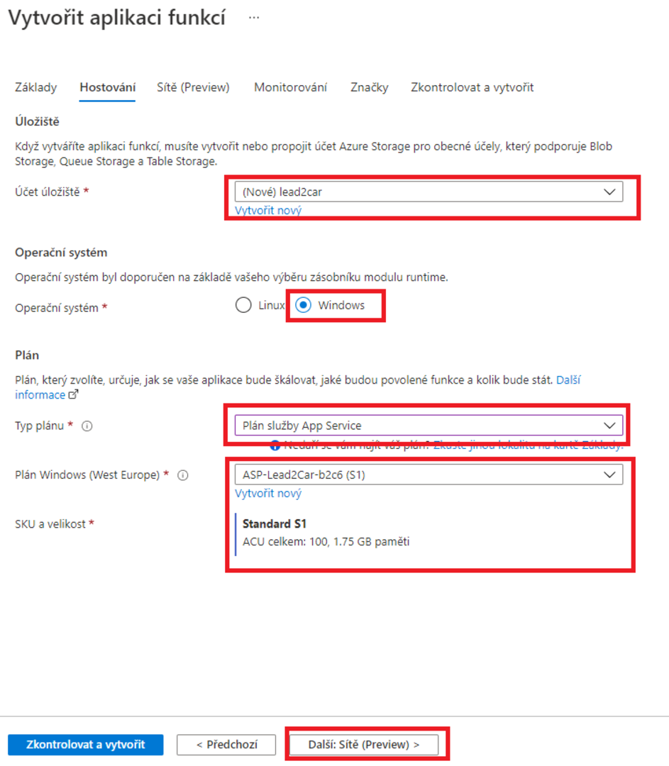 Další obrazovku opět vyplňte podle obrázku níže. Úložiště i plán budete muset vytvořit nový. Následně opět klikněte na tlačítko Další.