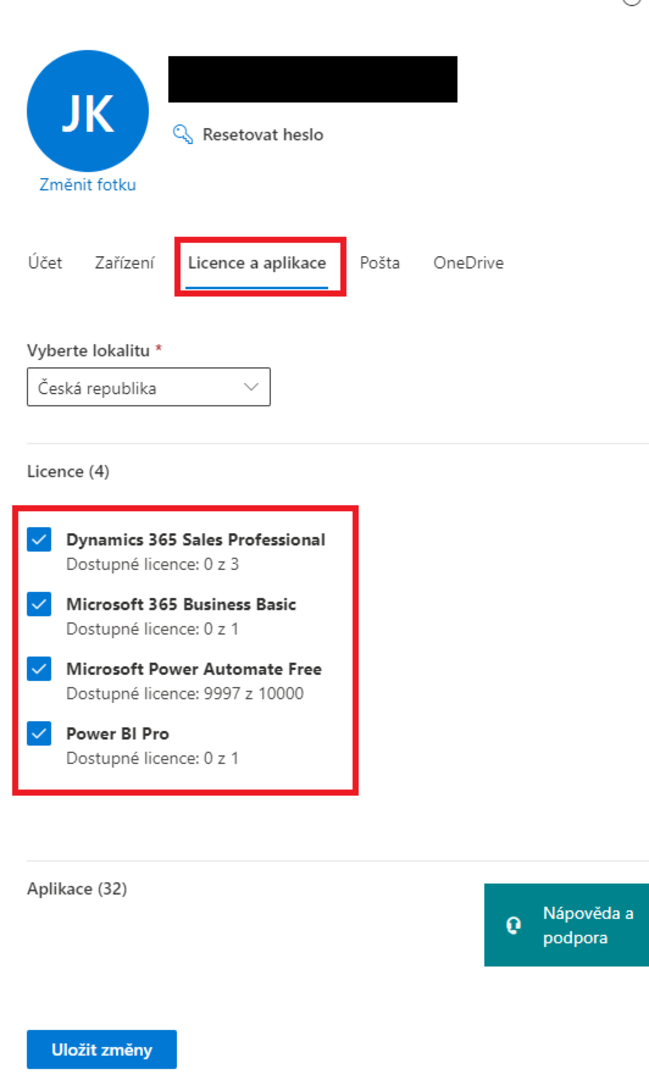 Licence se přiřazují na stejném portálu jako se vytváří uživatelé. V sekci Aktivní uživatelé nejdříve vyberte uživatele, kterému chcete přiřadit licenci. Následně zvolte kartu Licence a aplikace a zde uživateli zaškrtněte licence, které mu chcete přiřadit (například Dynamics 365 Sales Professional a Power BI Pro).