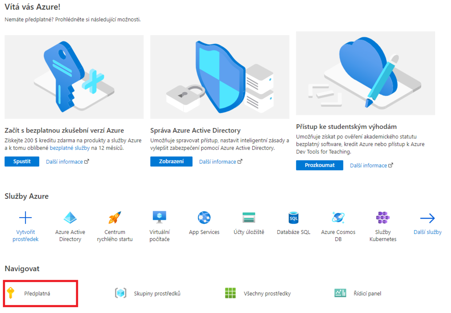 Azure subcription se vytváří v azure portálu na adrese portal.azure.com. Zde nejprve zvolte možnost předplatná (pokud možnost přímo nevidíte, tak použijte vyhledávač). Zobrazí se seznam aktuálně koupených předplatných. Následně zvolte možnost přidat.