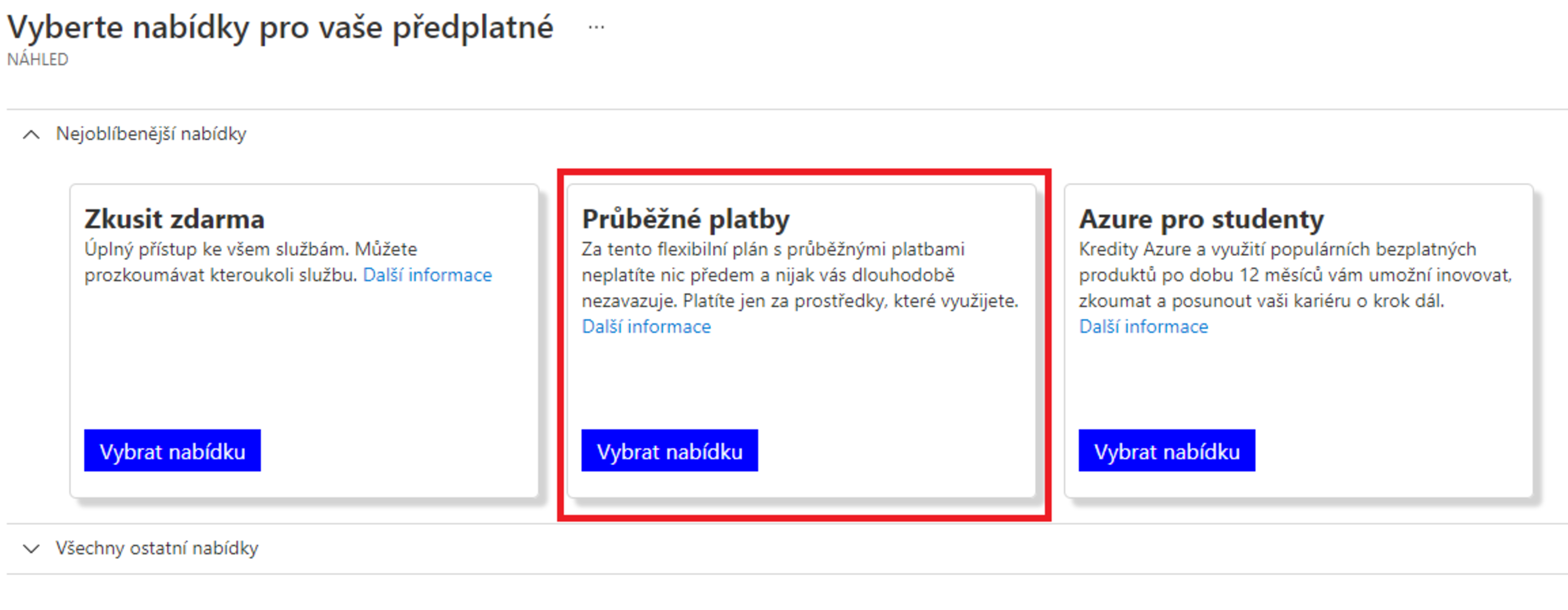 Následně vyberte možnost průběžné platby a na další stránce poté vyplňte platební údaje (během vyplňování platebních údajů nepřidávejte možnost technická podpora).