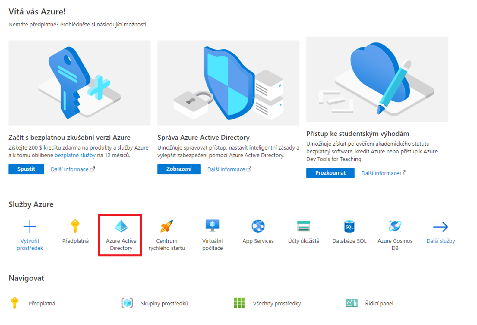 Opět se provádí v azure portálu. Nejprve zvolte možnost Azure Active Directory (pokud možnost přímo nevidíte, tak použijte vyhledávač).