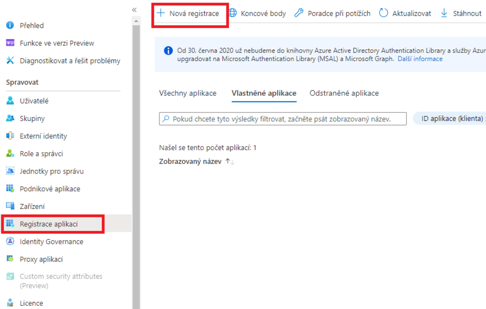 Zde zvolte možnost Registrace aplikací a následně Nová registrace.