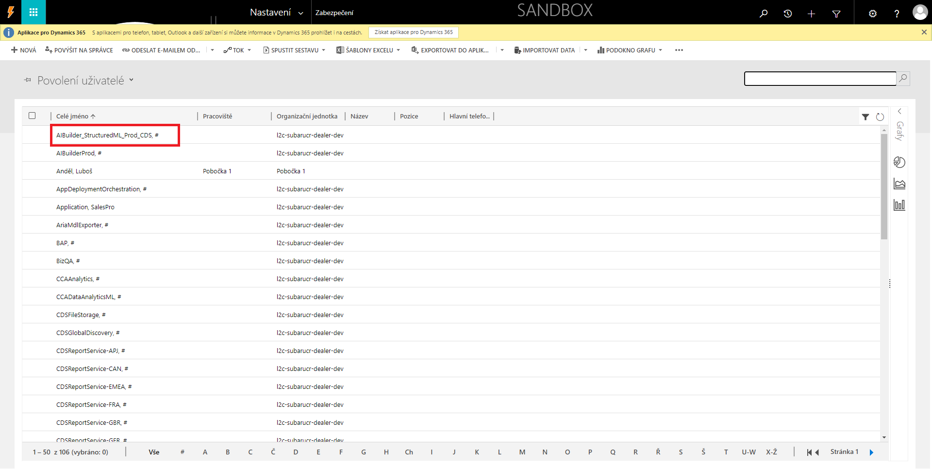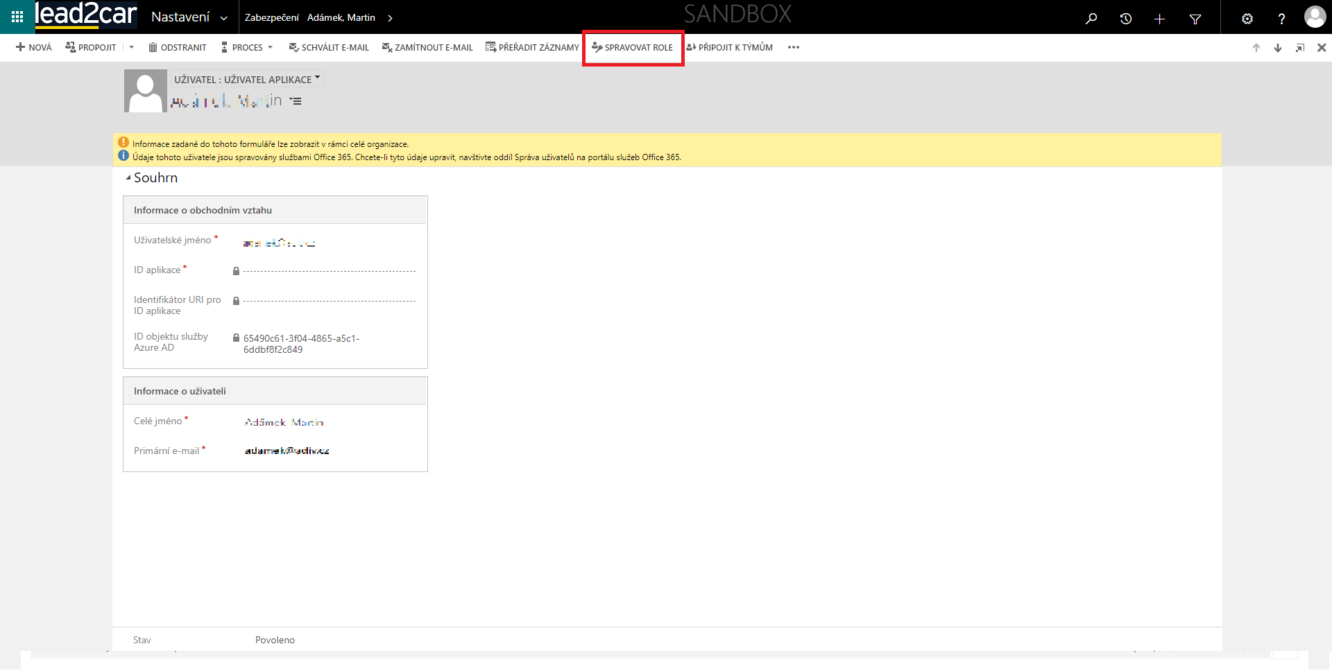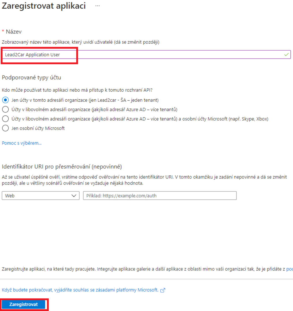 Zde vytvořte aplikačního uživatele Lead2Car Application User.