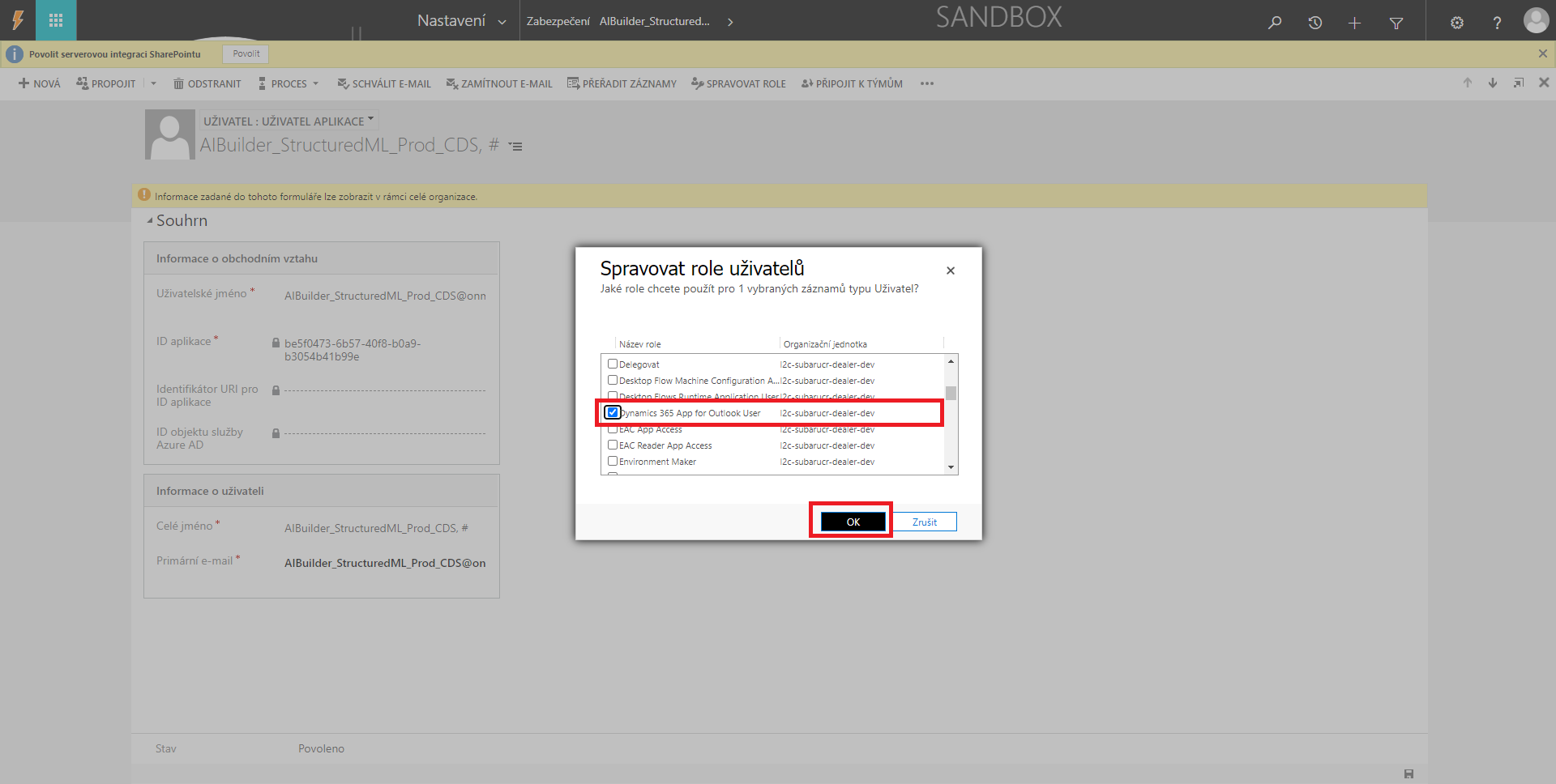 Otevře se vám karta, kde můžete spravovat role uživatelů. V seznamu s názvy rolí musíte najít ,,Dynamics 365 App for Outlook User". Až ji najdete, tak ji označte, a jednoduše vaši volbu potvrďte stisknutím tlačítka OK.