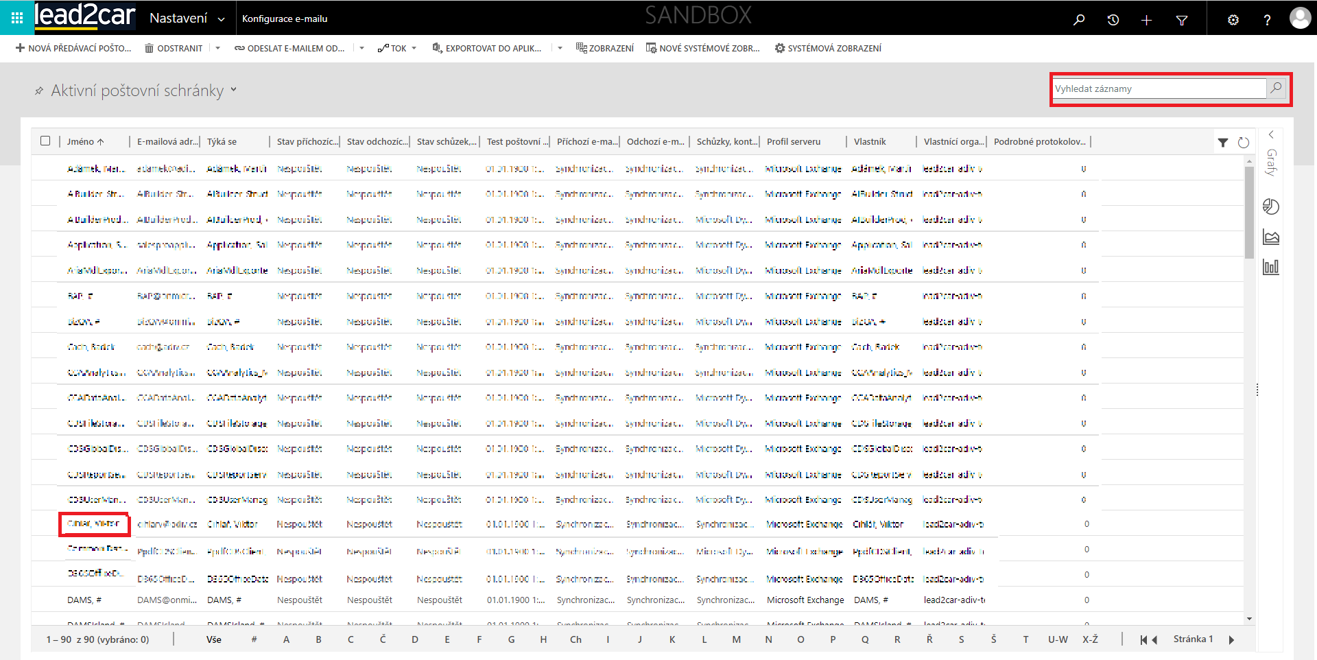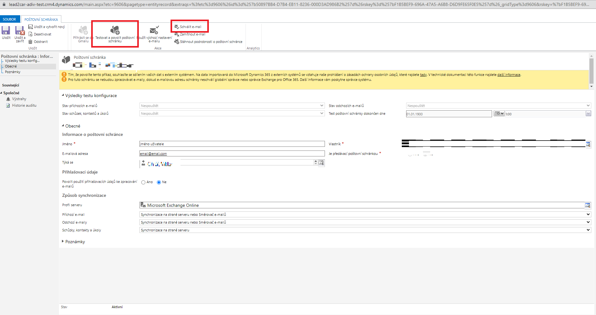 V tomto okně vidíte spoustu informací o vámi zvolené osobě. V dolní části se nachátí způsob synchronizace. Tady musíte příchozí e-mail a odchozí e-maily nastavit na ,,Synchronizace na straně serveru nebo Směrovač e-mailů". Schůzky, kontakty a úkoly nastavte na Synchronizace na straně serveru. Dále zvolte možnost ,,schválit email" z horního panelu, což se vám bude chvíli načítat. V momentě, kdy se vám to načte, zmáčknete ,,Uložit" vlevo nahoře, a zvolte možnost ,,Testovat a povolit poštovní schránku".
