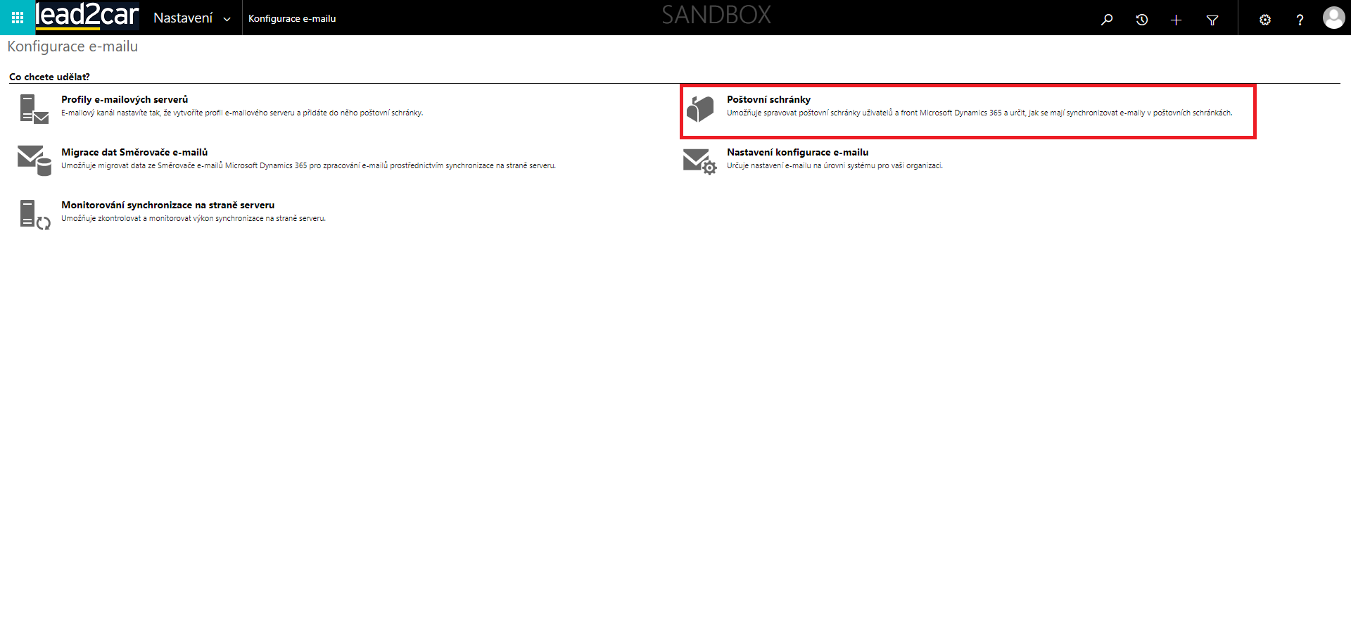 Následně klikněte na ikonku napravo od nastavení, která se nachází na horní liště, a vyberte možnost ,,konfigurace e-mailu".