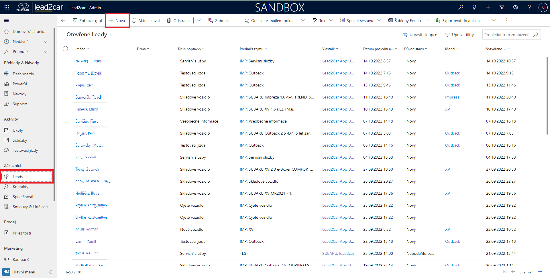 Nejdříve je třeba z levého menu vybrat možnost "Leady". Následně pro vytvoření nového leadu zvolte z horního panelu možnost "+ Nová".