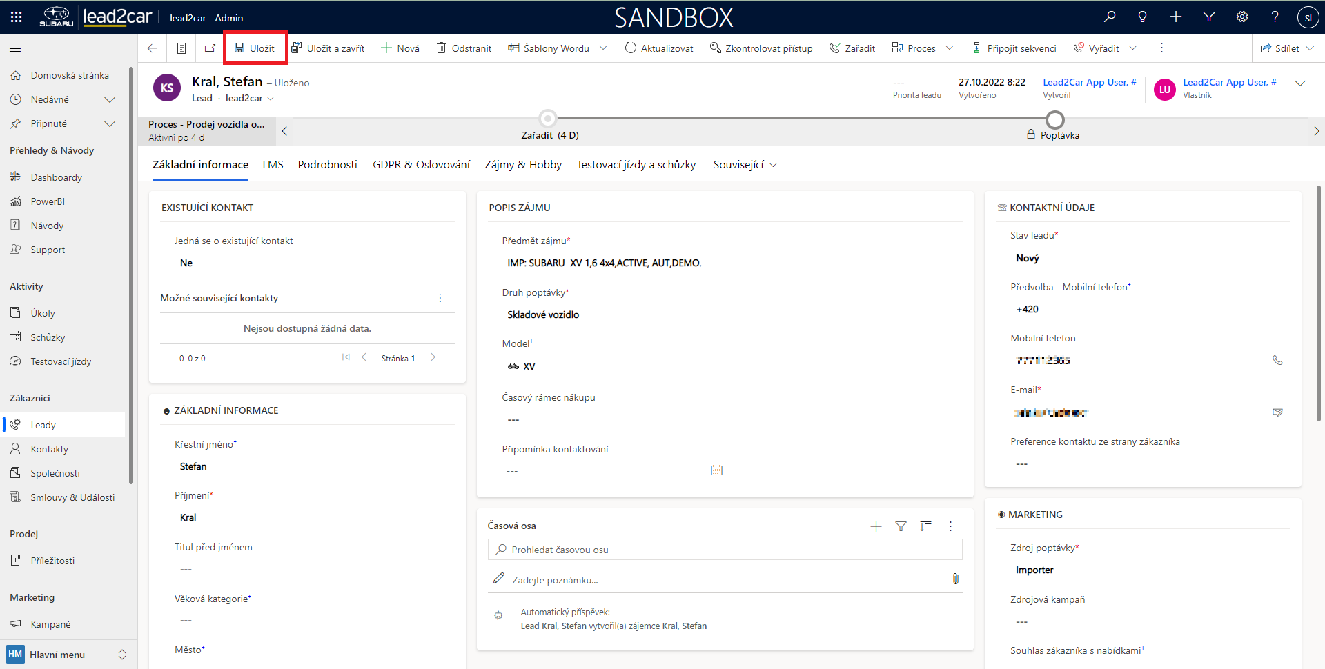 Nyní se otevře formulář pro vytvoření nového leadu. Vyplňte pole na tomto formuláři. Povinná pole jsou příjmení, předmět zájmu, zdroj poptávky a druh poptávky. Po vyplnění všech požadovaných údajů je třeba kliknout na horním panelu na možnost "Uložit".