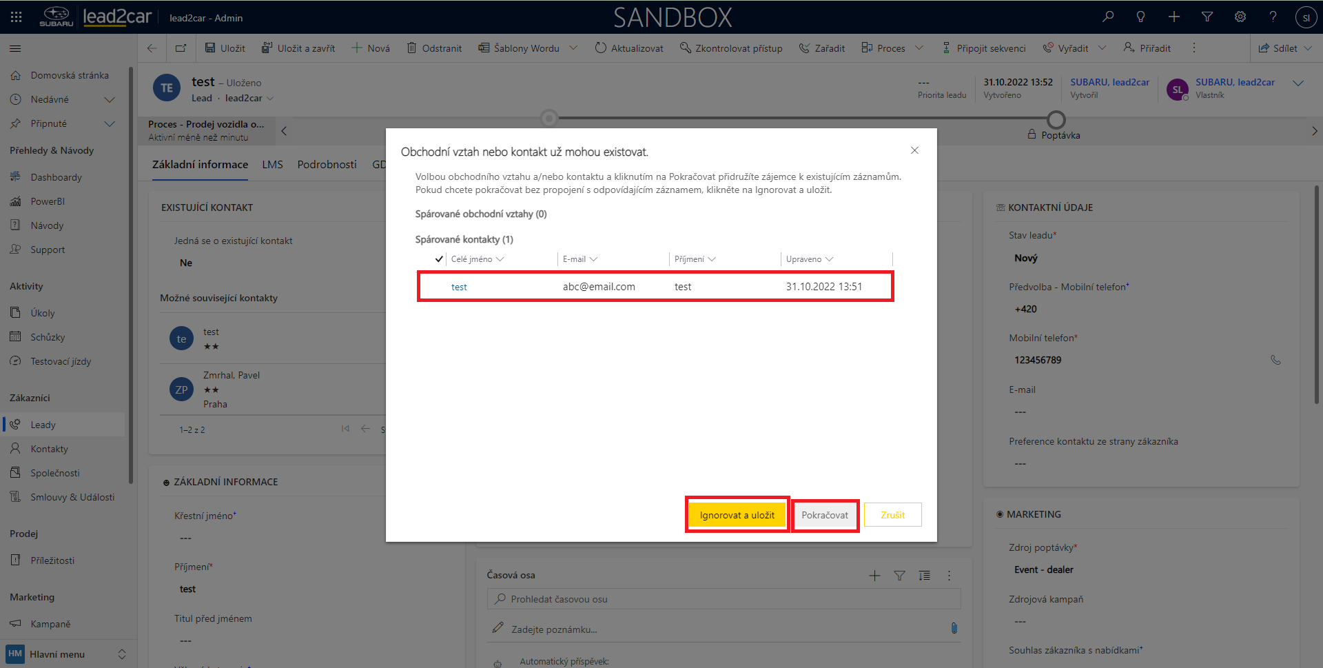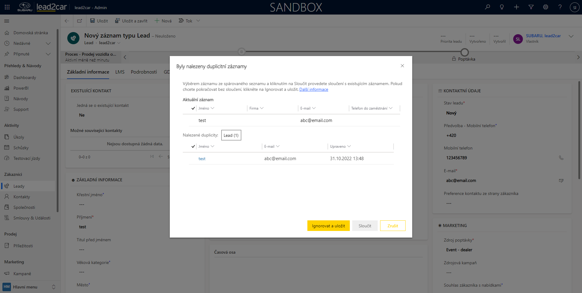 Pokud je vše v pořádku, tak se lead uloží. V případě, že systém detekuje možnost, že by stejný lead mohl v systému již existovat, tak se zobrazí následující okno. Zde lze zkontrolovat, zda se jedná opravdu o stejný lead a je možné tyto leady sloučit. V případě, že se jedná o jiný lead, zvolte "Ignorovat a uložit" a tím bude vytvořen nový záznam.
