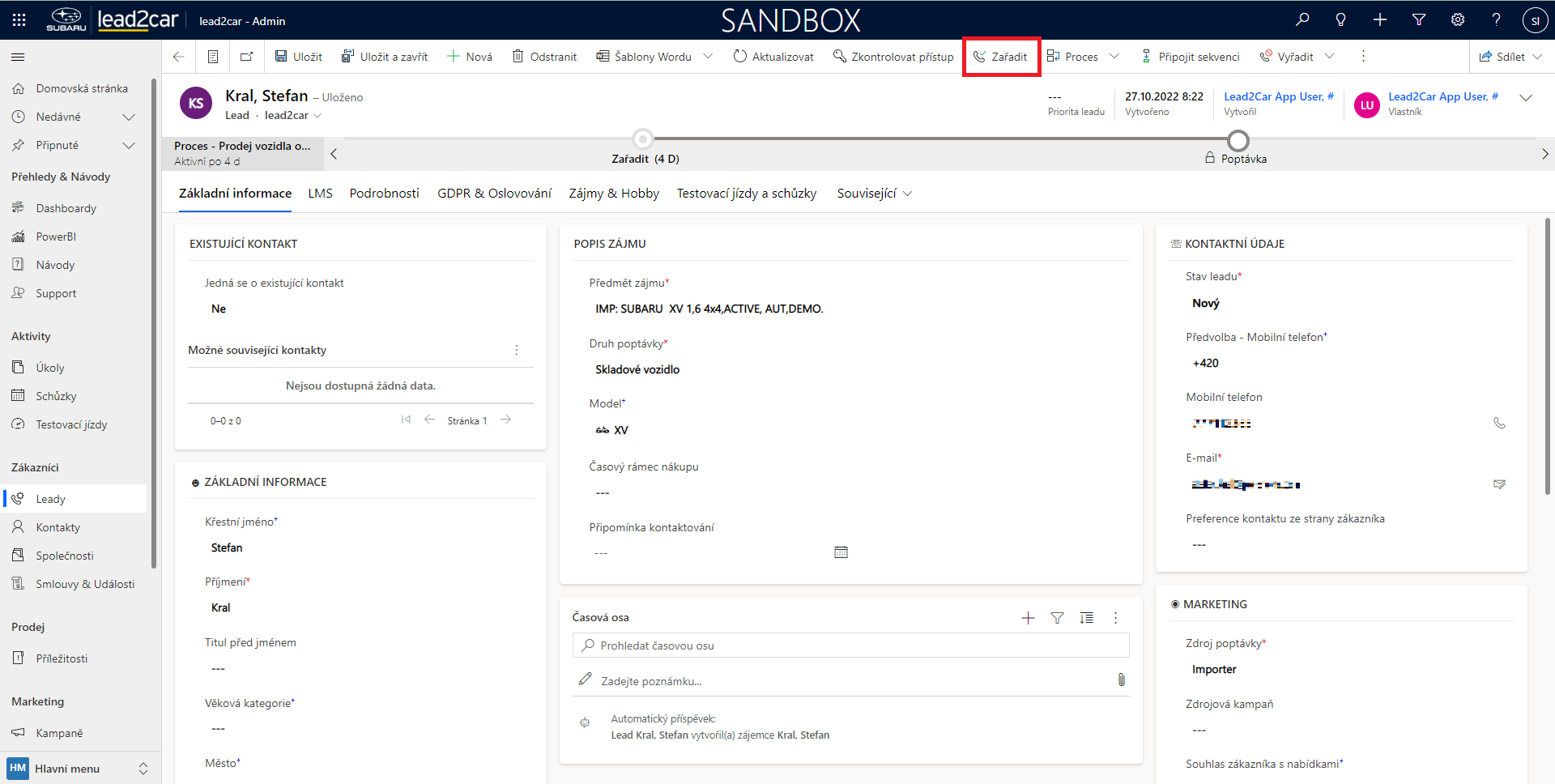 Nejdříve z levého menu vyberte možnost Leady. Následně otevřete ze seznamu požadovaný lead, který chcete zařadit. Pro zařazení leadu mezi kontakty (tedy deaktivaci leadu a vytvoření kontaktu) zvolte možnost "Zařadit" na horním panelu. Pokud je vše v pořádku, tak se současný lead deaktivuje a vytvoří se z něj nový kontakt.