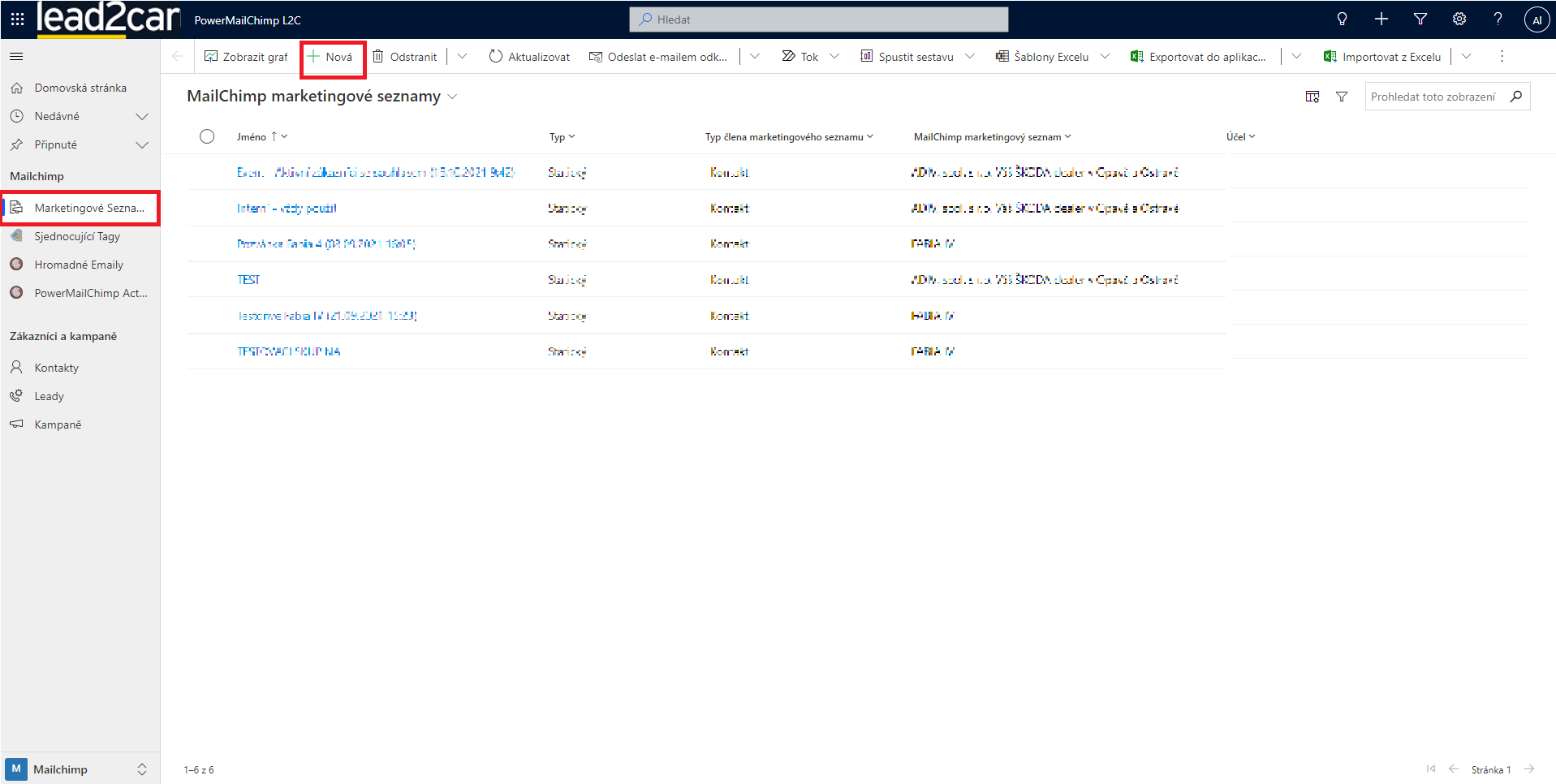 Nejdříve z levého menu vyberte možnost ,,Marketingové Seznamy“. Následně pro vytvoření nového seznamu zvolte z horního panelu možnost ,,+ Nová".