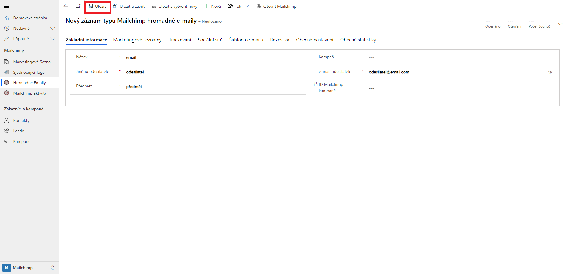 Zde je třeba vyplnit kategorie Název, Jméno odesílatele, Předmět, a e-mail odesílatele. Následně stačí vybrat možnost ,,Uložit“.