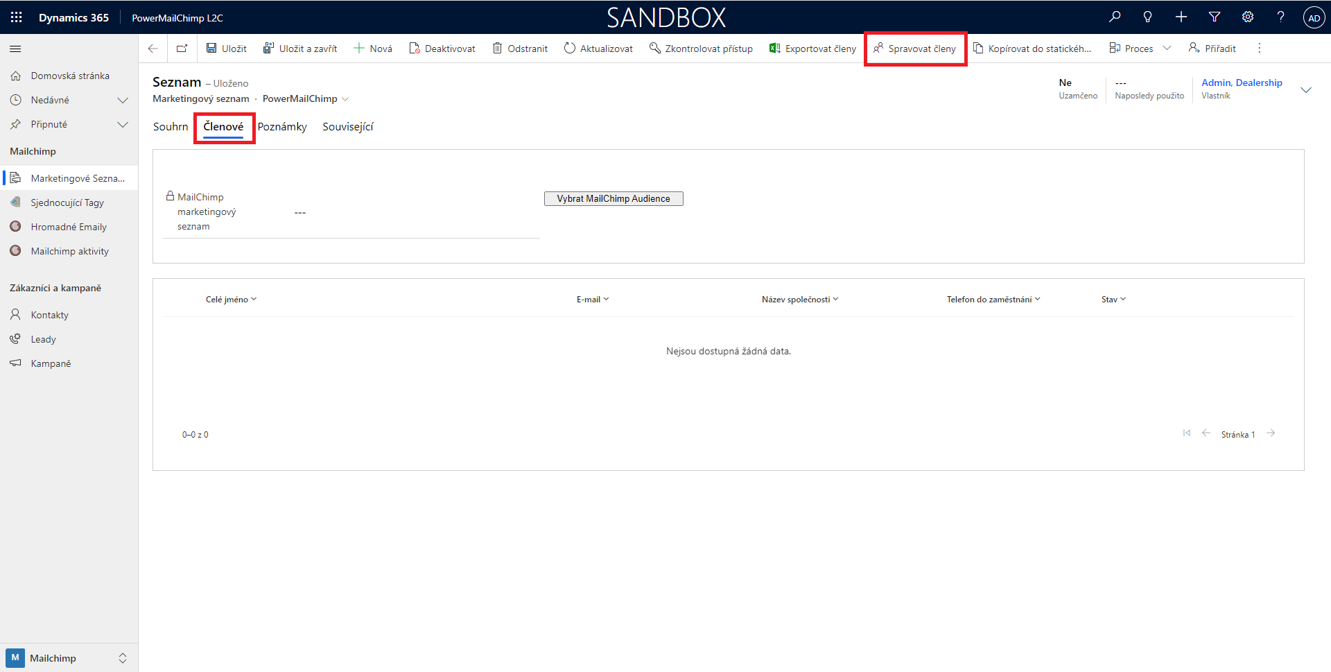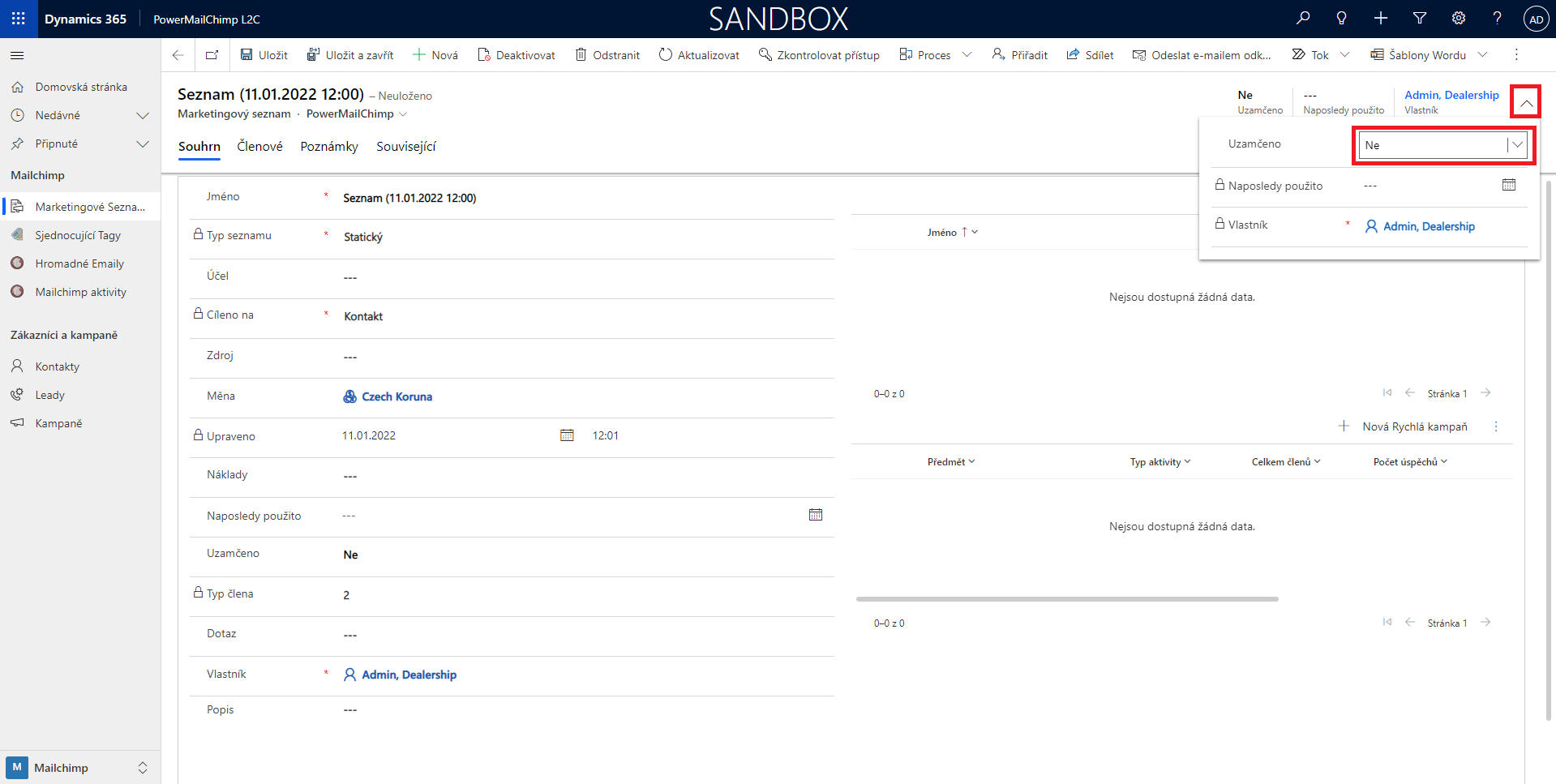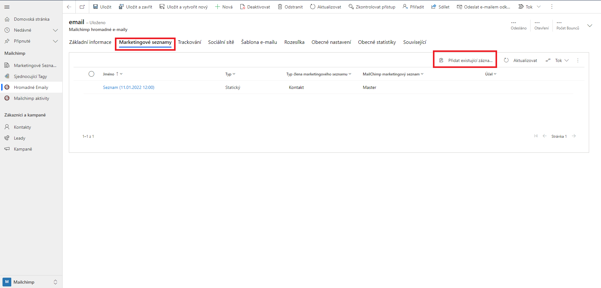 Dále je nutné vybrat vytvořený seznam. V menu nahoře vyberte ,,Marketingové seznamy“, a zvolte možnost ,,Přidat existující záznam“ z panelu nahoře. Zde stačí vybrat, který seznam chcete použít, a přidat ho.