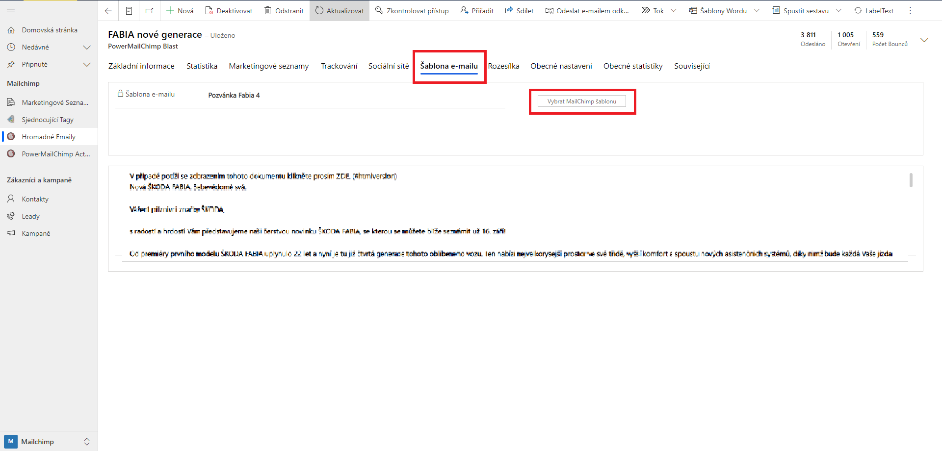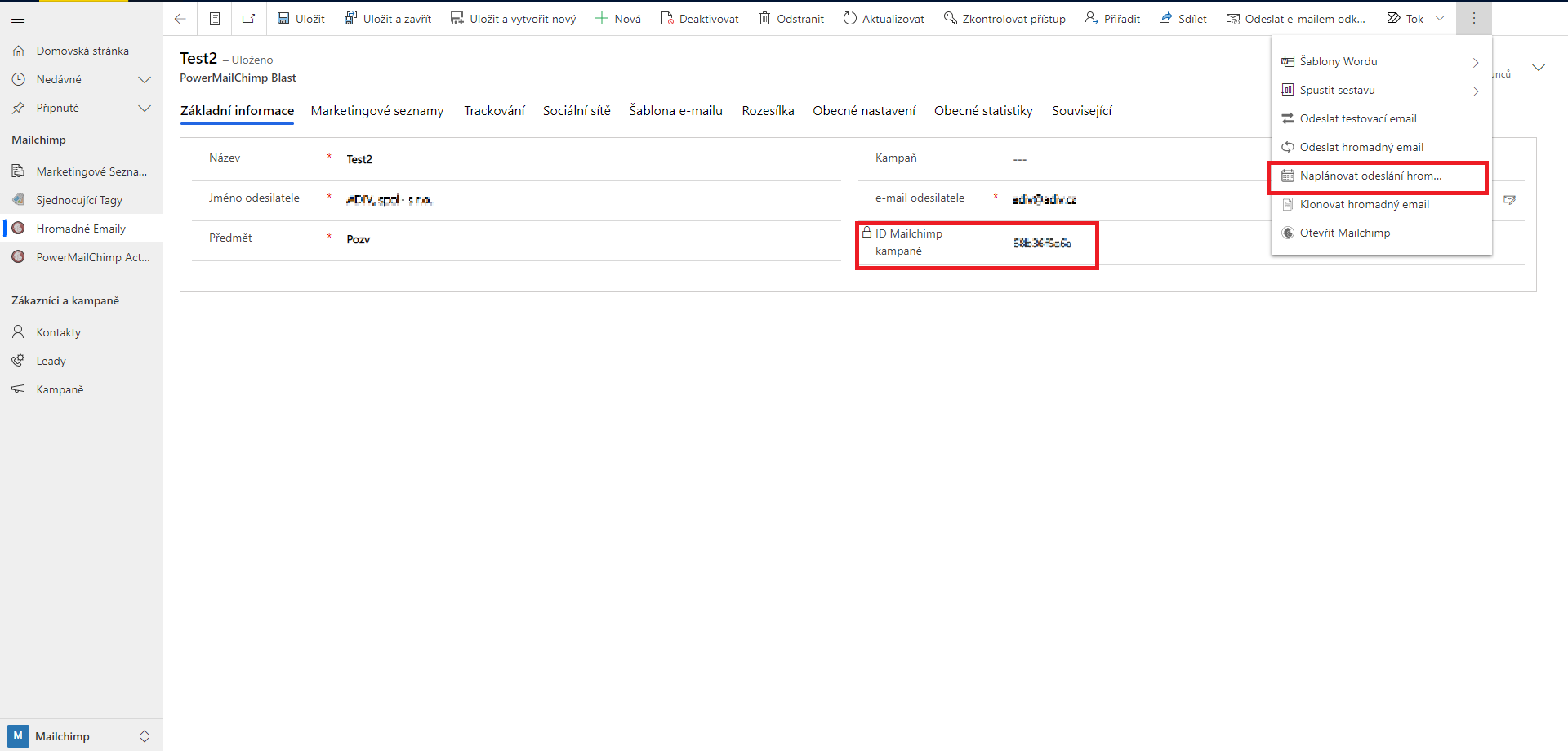 V tento moment už zbývá pouze naplánovat odeslání e-mailu. V panelu ,,Základní informace“ lze ověřit propojení s MailChimp, poté je vše připraveno k odeslání. To poznáte podle toho, že v kolonce ,,ID Mailchimp kampaně“ je načtený kód, jak můžete vidět na obrázku. Nakonec už jen zvolte možnosti vpravo nahoře a vyberte ,,Naplánovat odeslání“.