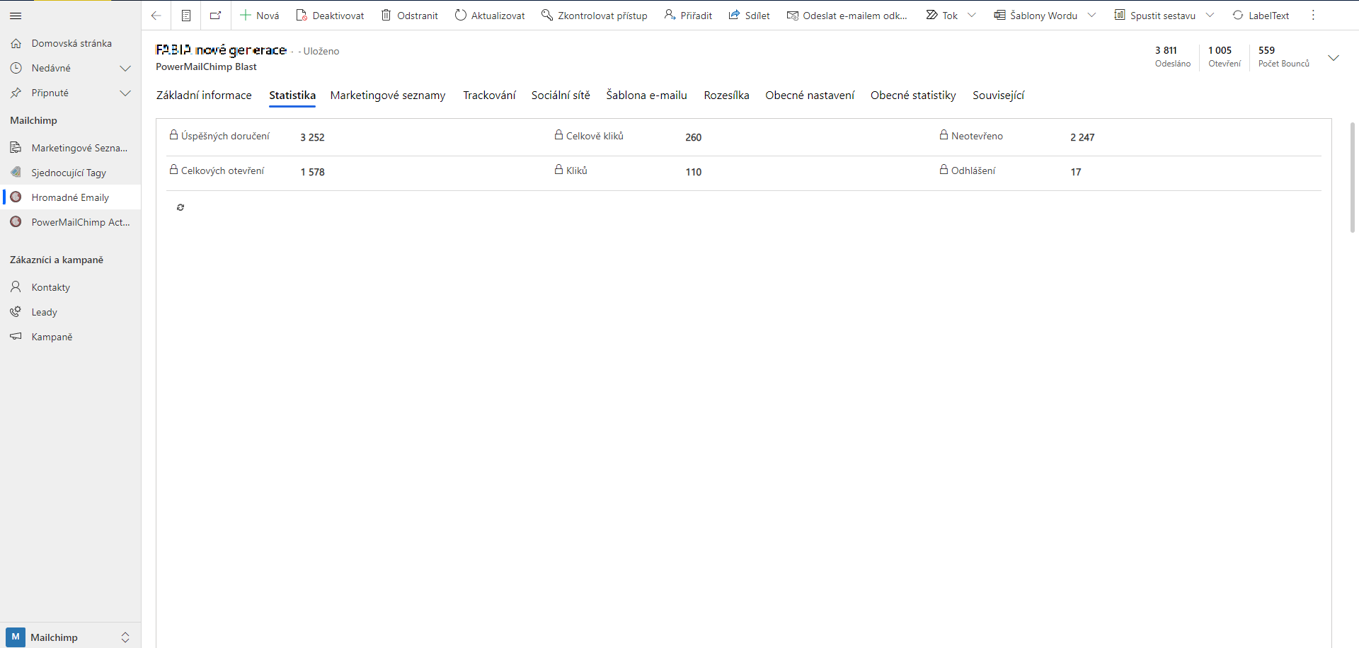 Po odeslání e-mailu se v horním panelu objeví nová kolonka, a to ,,Statistika“. Zde lze ověřit počet úspěšně doručených e-mailů, počet neotevřených e-mailů a další důležité informace, se kterými můžete pracovat.