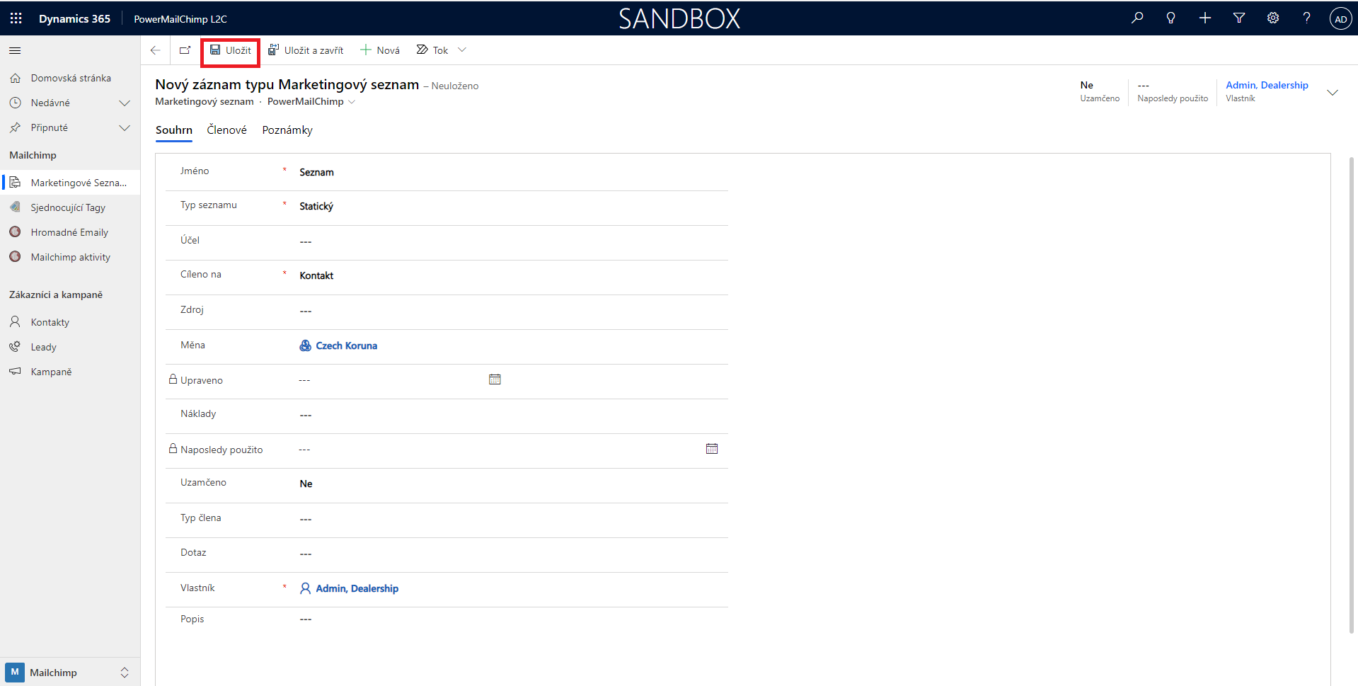 Nyní se otevře se Vám formulář pro vytvoření nového seznamu. Vyplňte pole na tomto formuláři. Povinná pole jsou jméno, typ seznamu, a cíleno na. U „Typ seznamu“ je na výběr mezi statickým a dynamickým seznamem. U statického seznamu si jmenovitě vyberete členy daného seznamu. U dynamického seznamu lze vybrat určité podmínky, podle kterých budou členové neustále přidáváni. Po vyplnění všech požadovaných údajů klikněte na horním panelu na možnost ,,Uložit“.