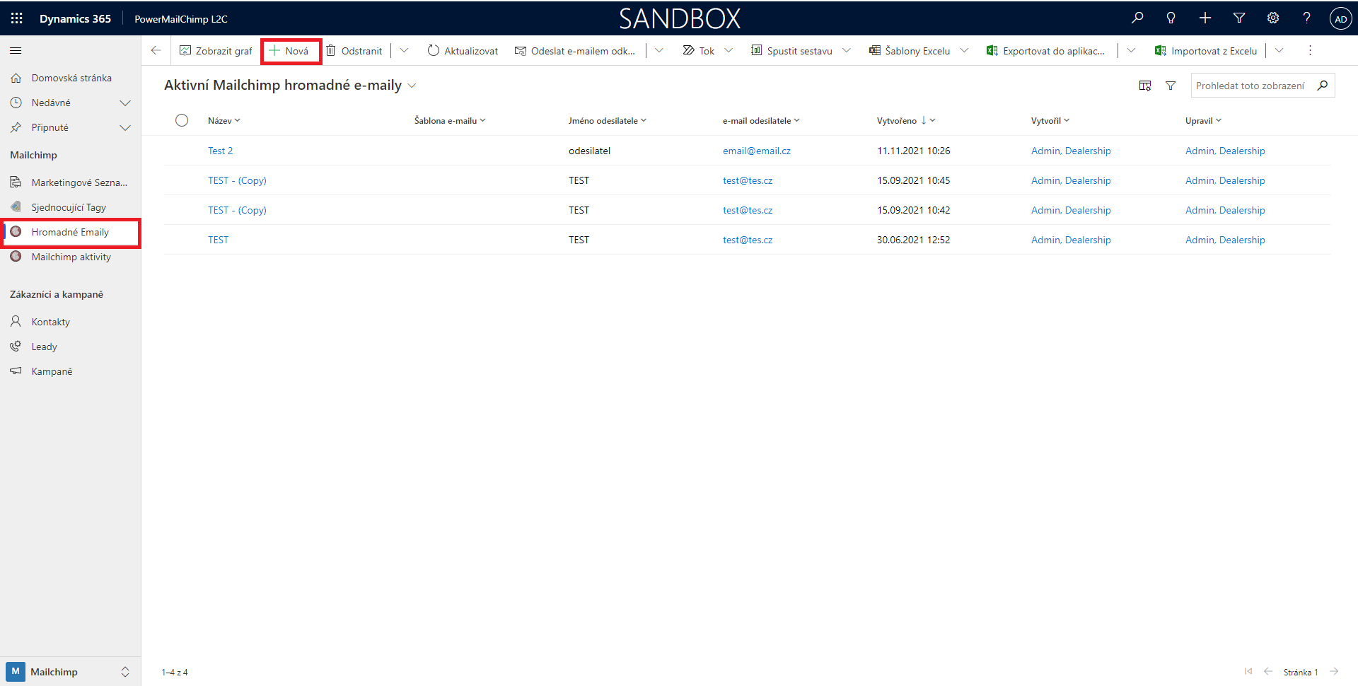 Pro vytvoření hromadného e-mailu vyberte v panelu napravo ,,Hromadné emaily“ a v panelu nahoře vyberte ,,+Nová“.