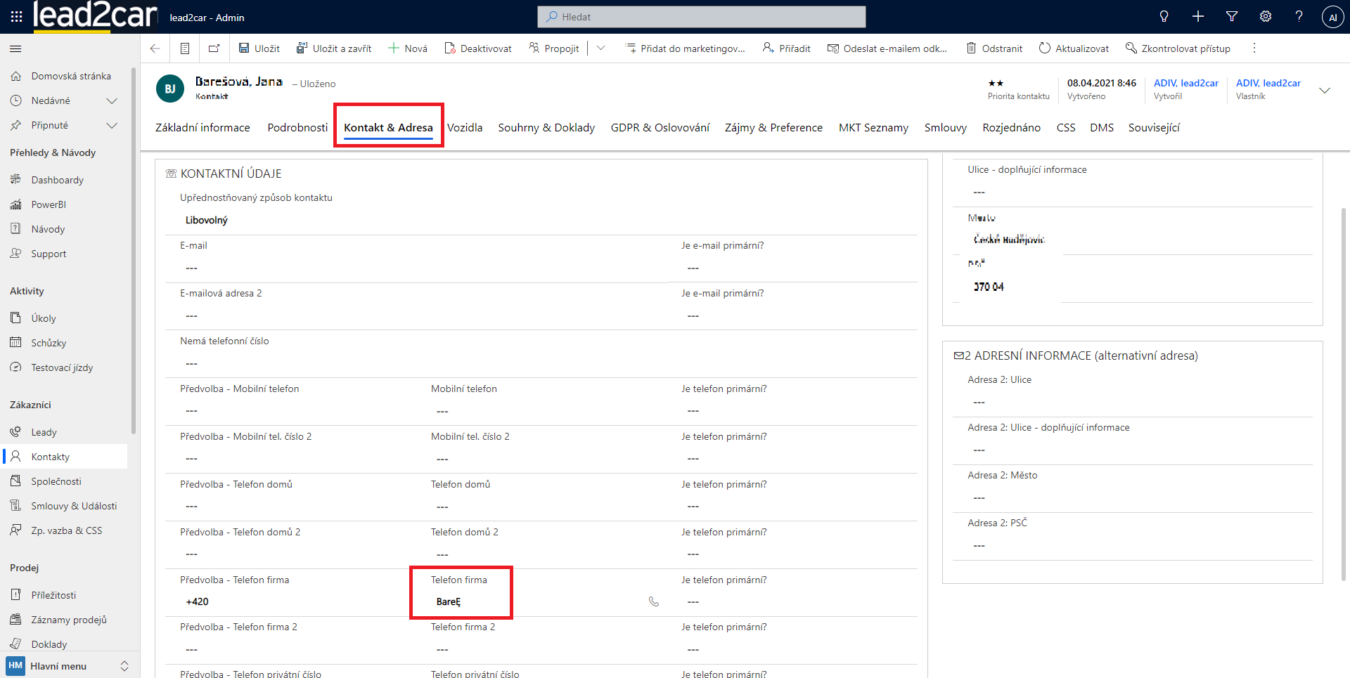 Zde je potřeba projít postupně jednotlivé záznamy. Při otevření kontaktu je nutné přejít na záložku "Kontakt & Adresa". Zde je možné nalézt telefonní čísla. Jsou dvě možností jak špatné číslo opravit. Jedna je číslo smazat, a později doplnit, až se od klienta dozvíte správné číslo. Druhá možnost, je že telefon je zapsaný, a pouze je ve špatném formátu (např. 123456789Novák). V tento moment stačí číslo jednoduše opravit. Po jakékoli činnosti je nutné daný kontakt uložit pomocí tlačítka "Uložit" vlevo nahoře.