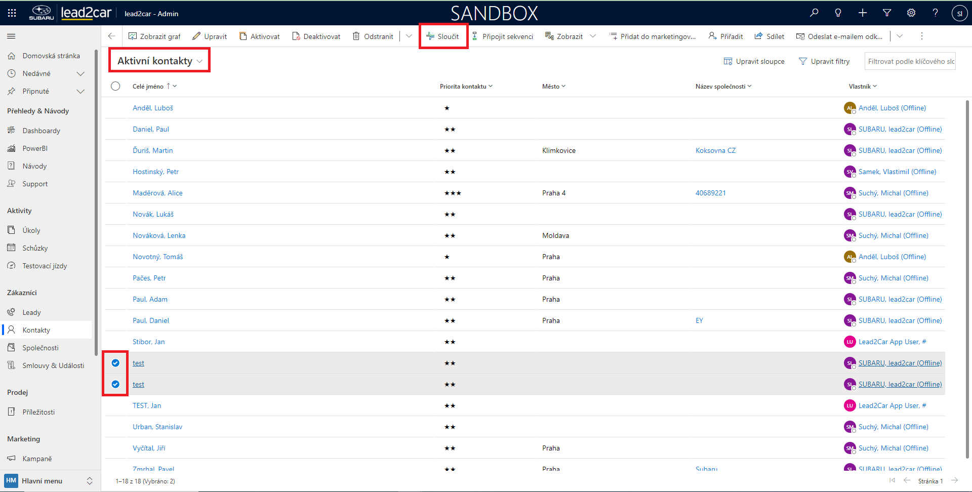 Následující postup je již nutné opakovat pro každý podezřelý kontakt. Zkopírovat jméno z první otevřené karty a vložit ho do vyhledávání v druhé kartě. Pokud se objeví pouze jeden kontakt, tak je vše v pořádku a není třeba nic řešit. Pokud se ale objeví 2 kontakty, tak je potřeba zjistit zda se jedná o totožné kontakty, a případně je sloučit. Jeden bude mít jako vlastníka nějakého člověka, a druhý bude mít jako vlastníka Lead2Car Application User. Oba tyto kontakty je nutné označit a z panelu v horní části zvolit tlačítko "sloučit"