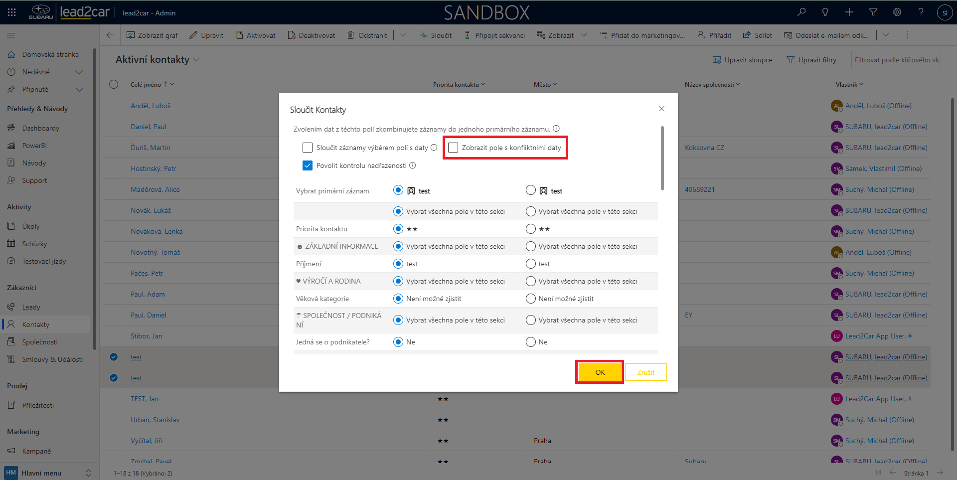 Objeví se karta se sloučením dat. Zde nesmí být zaškrtnuto pole "Zobrazit pole s konfliktními daty". Díky tomu uvidíte všechny informace o obou kontaktech. Dále už je potřeba projít informace a hledat zda se shodují, či jsou rozdílné. Především email a telefon jsou důležité. Pokud mají oba kontakty stejný email, tak se skoro určitě jedná o jeden kontakt a naopak pokud jsou telefony rozdílné tak to není stejný kontakt. Pokud se zjistí, že dané dva kontakty nejsou stejné, tak stačí sloučení prostě zrušit. Na druhou stranu pokud kontakty jsou totožné, tak se musí sloučit. V kolonce primární záznam je vhodné zvolit ten kontakt, který má jako vlastníka člověka. U ostatních řádků je vhodné zvolit ten sloupec, který má více informací. Až je vše označené,tak stačí zmáčknout tlačítko "OK".