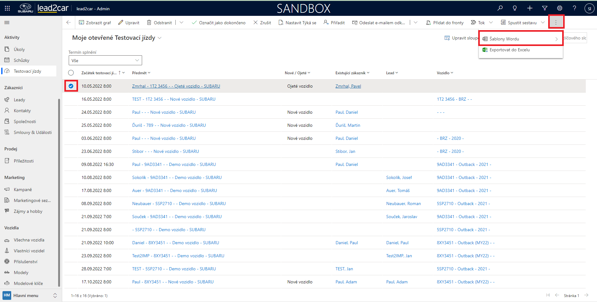 Word Šablony si můžete otevřít ve více entitách. Na obrázu je ukázka z entity Testovací jízdy. Pro vytvoření formuláře stačí označit nějaký záznam, a zmáčknout tlačítko "Šablony word", které se nachází na horní liště. Pokud není vidět, tak si na liště musíte nejdřív rozkliknout tři tečky, a tam vybrat Šablony. Následně je třeba zvolit konkrétní šablonu, která se automaticky stáhne. V případě dat o klientech je potřeba udržovat Lead2Car co nejvíc aktuální. Pokud se něco změní u samotného dealera (např. název firmy), tak musíte dát vědět podpoře Lead2Car, která danou infromaci ve formulářích aktualizuje.