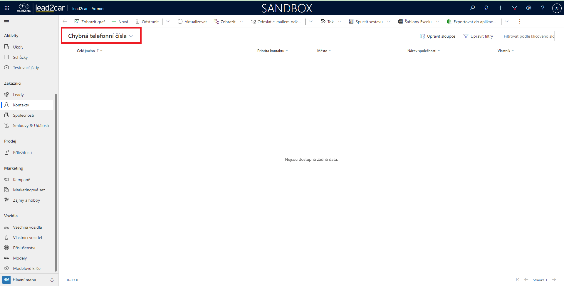 Zákaznící občas zapíší nesmyslné telefonní číslo, které je třeba manuálně opravit. V entitě Kontakty je možnost vygenerovat si seznam kontaktů s chybnými čísly. Při rozkliknutí zobrazení je třeba zvolit přímo zobrazení nazvané "Chybná telefonní čísla".