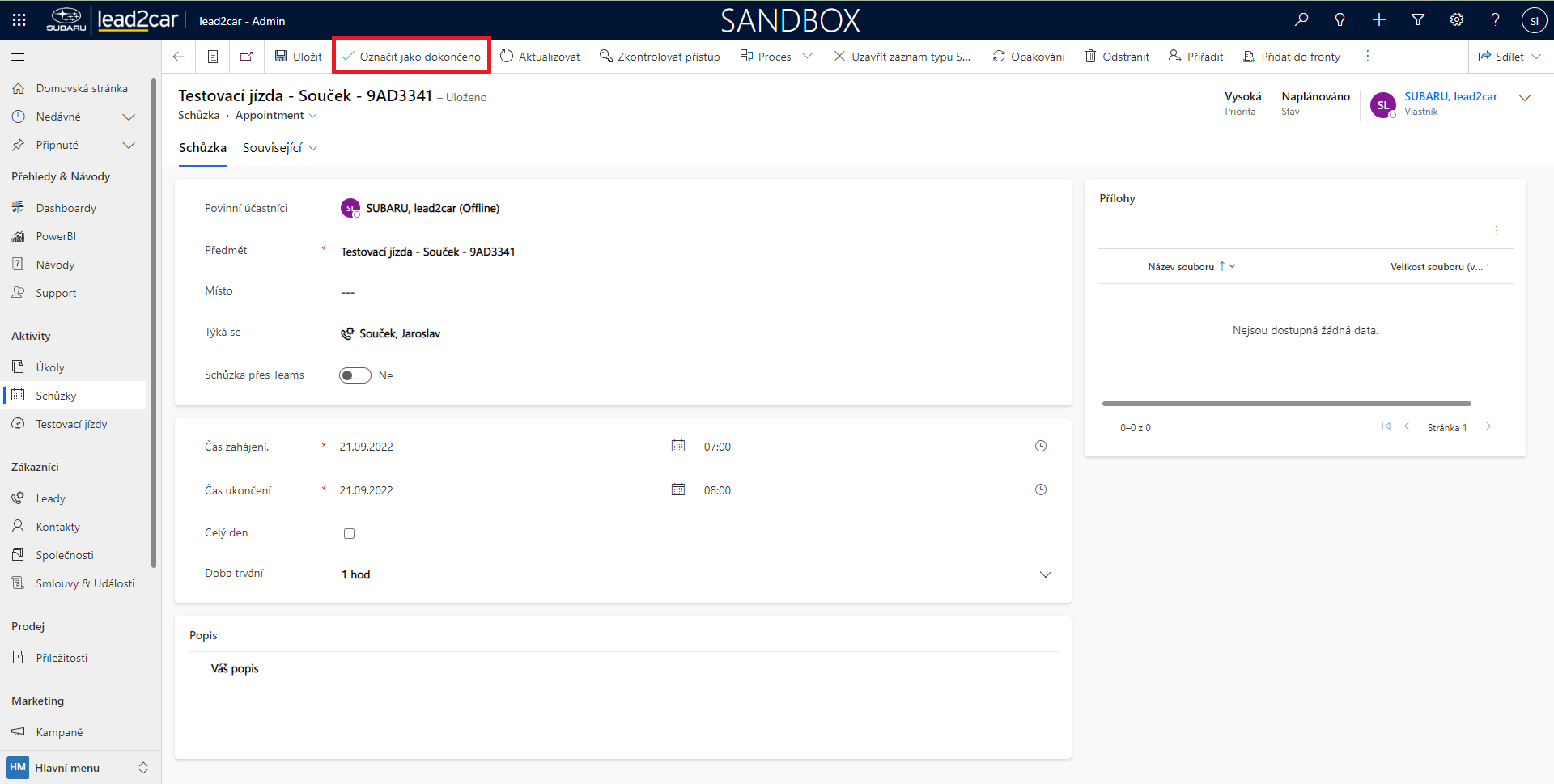Schůzku je možné uzavřít dvěma způsoby. Prvním je označit ji jako dokončenou. V tom případě se záznam uzamkne, nebude jej možné dále editovat, a bude možné ho nalézt pomocí zobrazení "Moje uskutečněné schůzky" na záložce “Schůzky“.