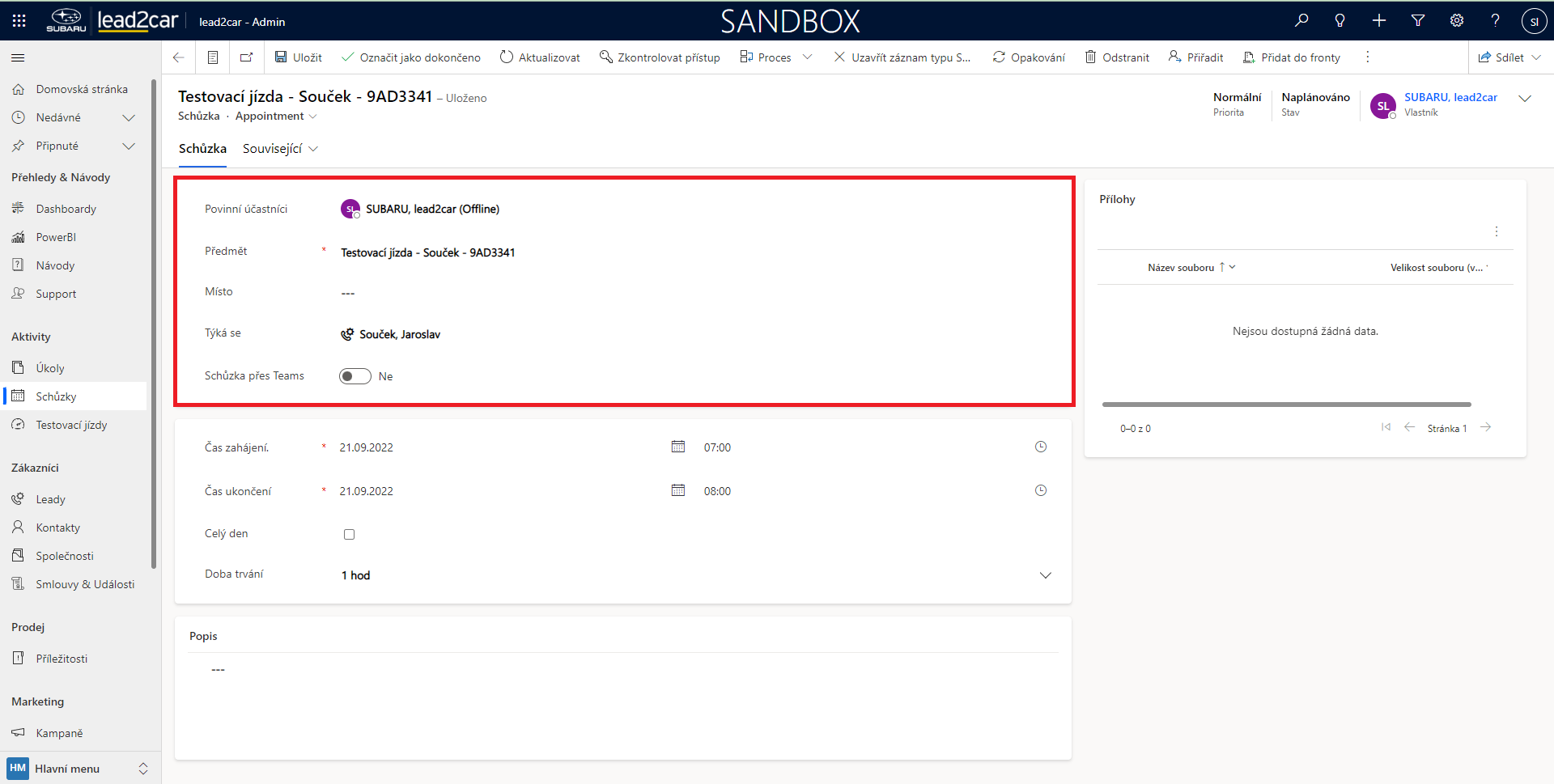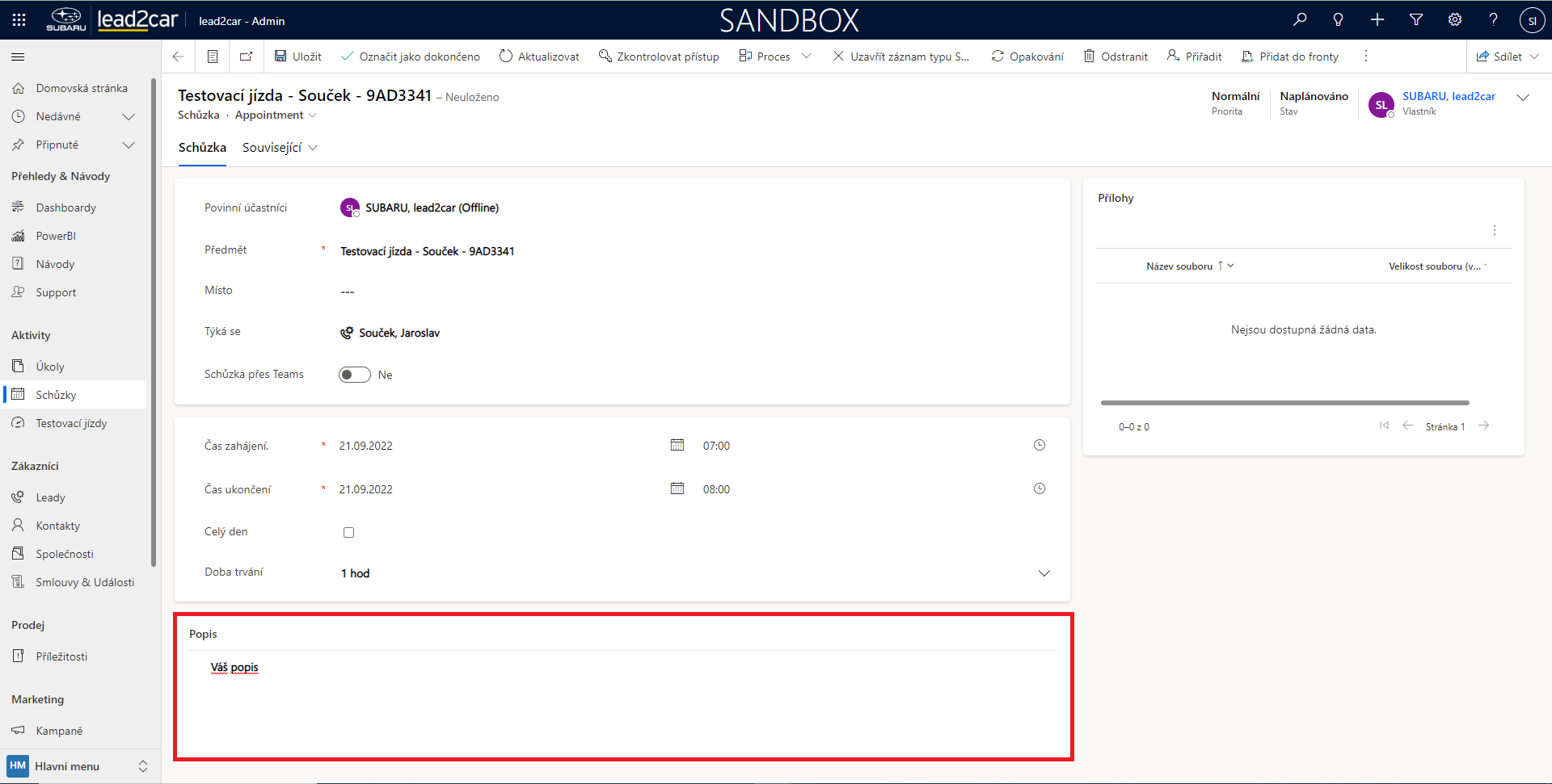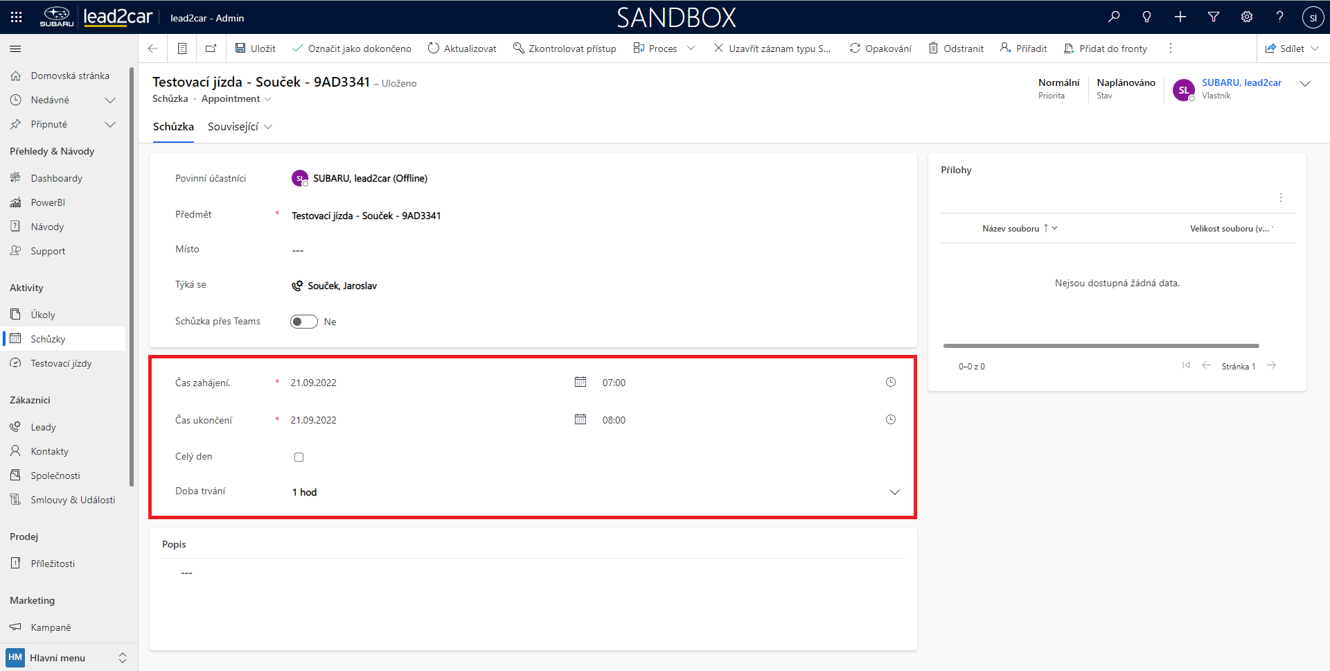 Nyní se otevře formulář pro vytvoření nové schůzky. Zde je třeba vyplnit Povinné účastníky, Předmět a Místo konání schůzky. Dále je možné přidat „Týká se“. Poté je nutné vyplnit čas schůzky. Po uložení záznamu se schůzka automaticky objeví v Plánovači. Ke schůzce lze také přidat poznámku, nebo vložit přílohu, což může být libovolný soubor. Přílohy je možné vložit pouze po uložení.