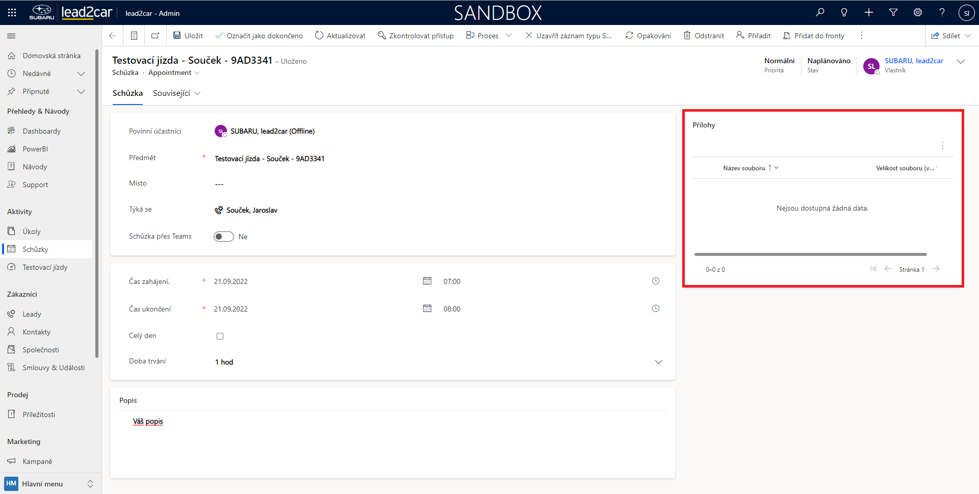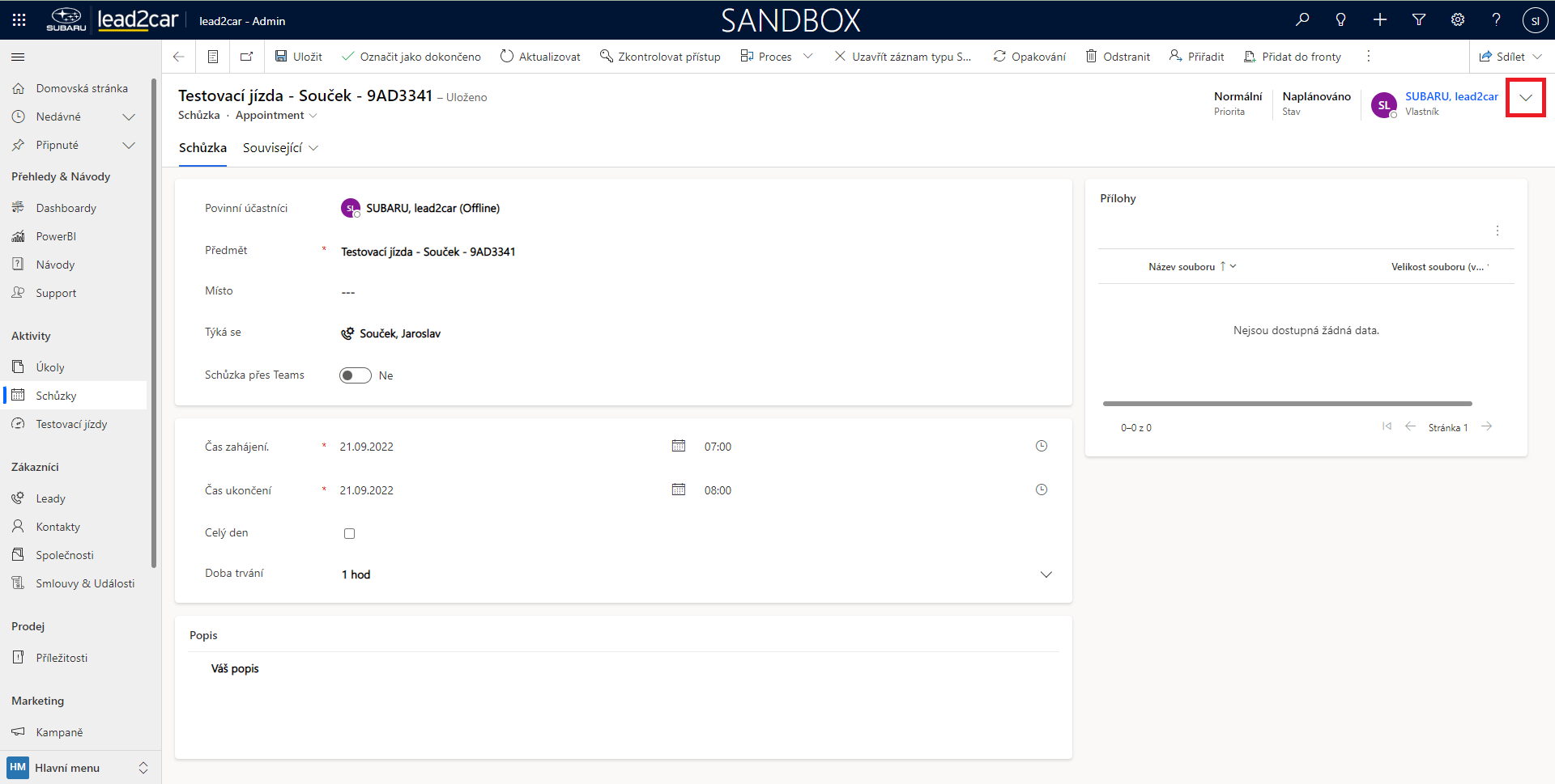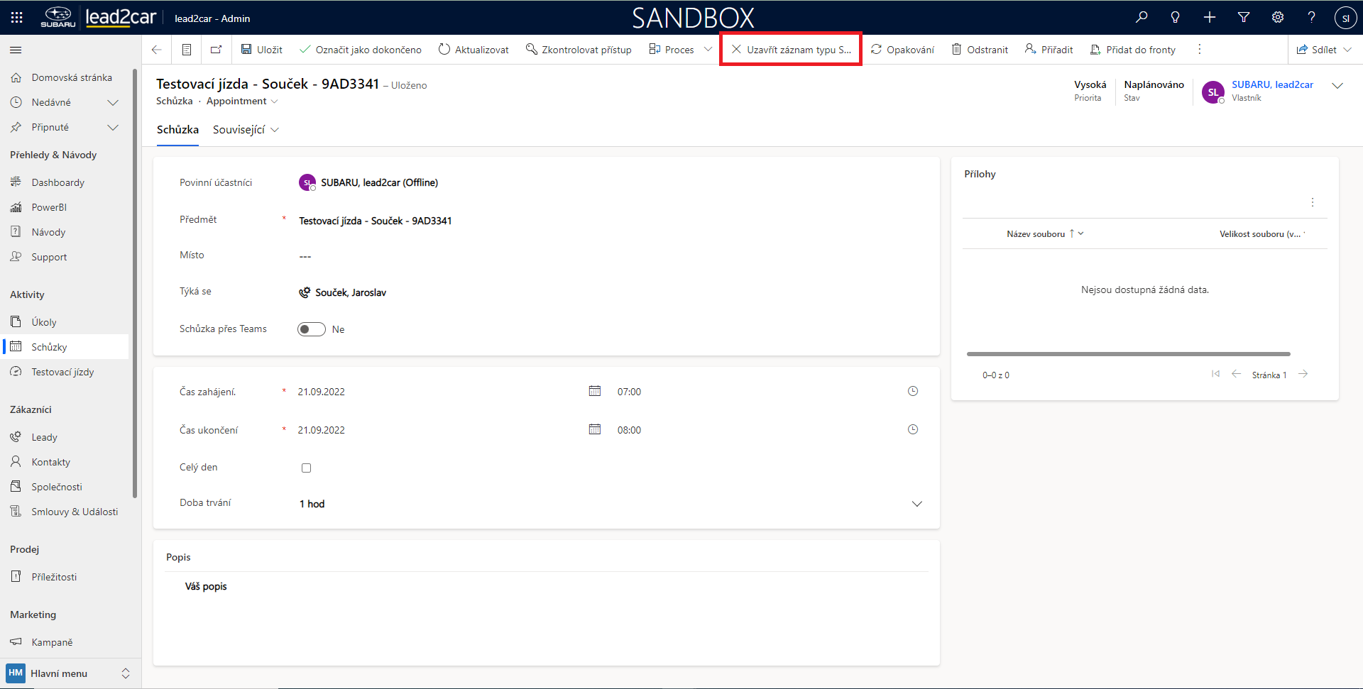 Nyní se otevře formulář pro vytvoření nové schůzky. Zde je třeba vyplnit Povinné účastníky, Předmět a Místo konání schůzky. Dále je možné přidat „Týká se“. Poté je nutné vyplnit čas schůzky. Po uložení záznamu se schůzka automaticky objeví v Plánovači. Ke schůzce lze také přidat poznámku, nebo vložit přílohu, což může být libovolný soubor. Přílohy je možné vložit pouze po uložení.