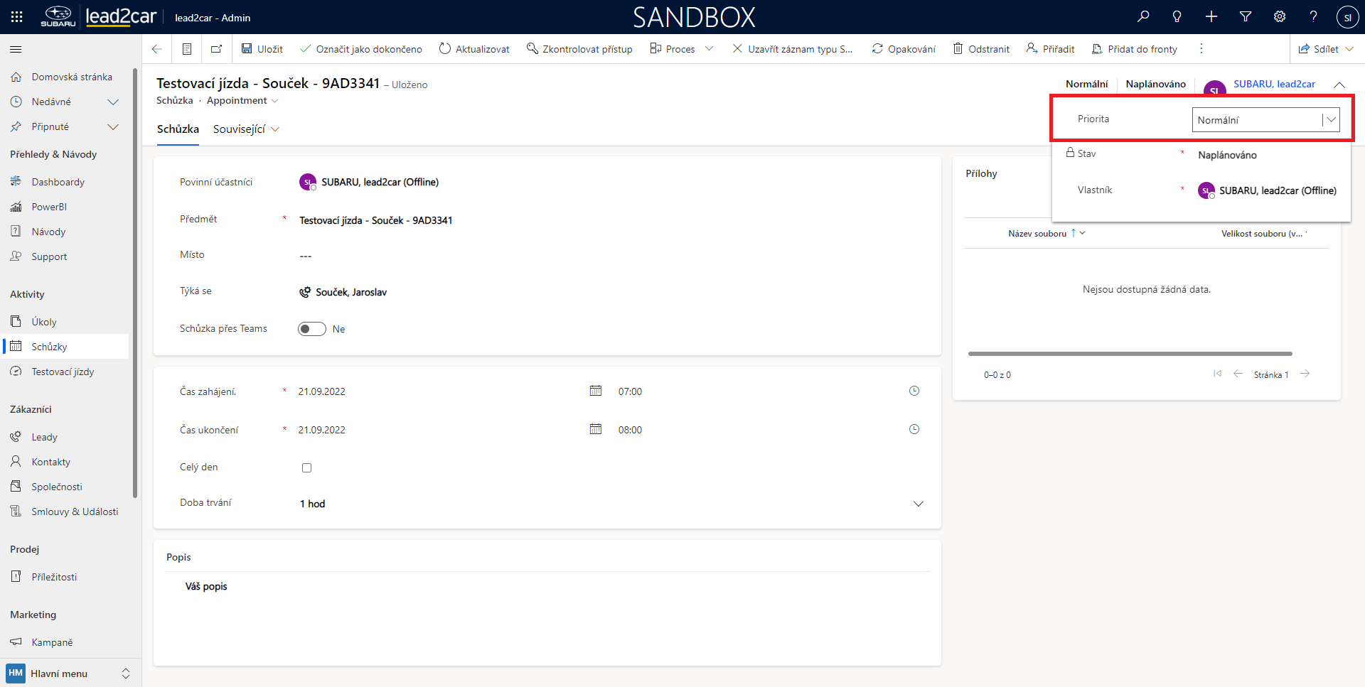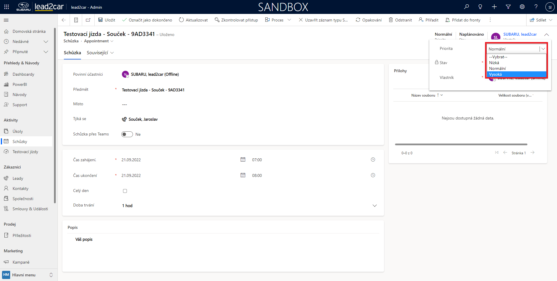 Schůzce je možné také nastavit prioritu. Po kliknutí na šipku vpravo nahoře se objeví výběr ze 3 možností - nízká, normální, vysoká.