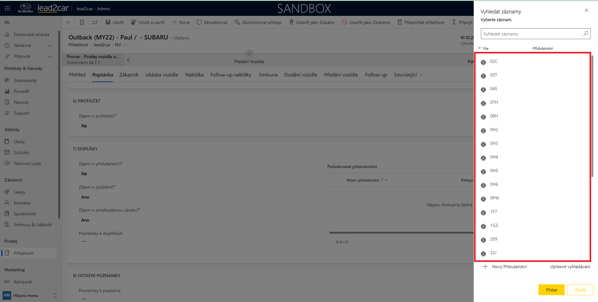 Dalším boxem, který je třeba vyplnit, jsou "Doplňky". Zde lze zvolit, zda má klient zájem o další příslušenství, pojištění, protiúčet, prodlouženou záruku nebo o servisní balíčky. Pokud má Zákazník zájem o příslušenství, klikněte na "Přidat existující záznam". Objeví se vyhledávací okno, kam lze napsat kód příslušenství, případně kliknout na ikonku lupičky a najít požadované příslušenství.