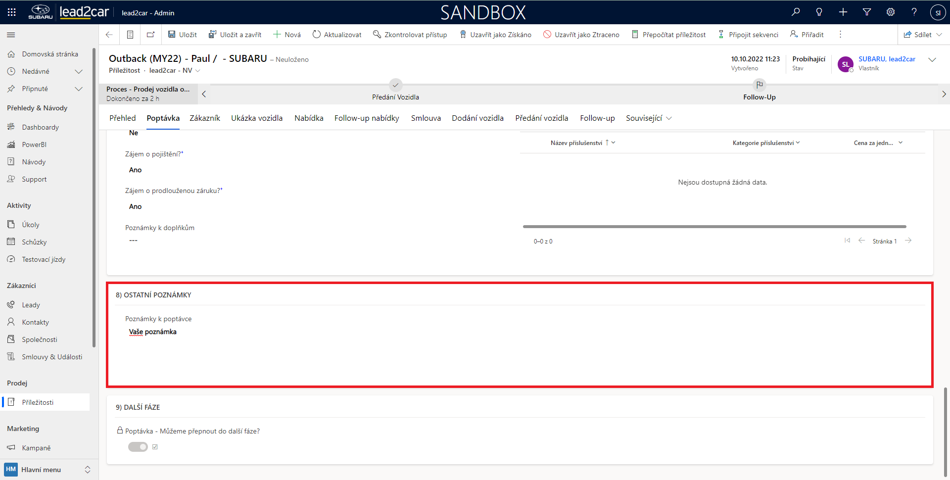 Nakonec lze k ukázce vozidla přidat poznámku. V posledním boxu je možné zakliknout "Přepnout do další fáze". Toto pole se odemkne až po uložení záznamu a po jeho zakliknutí budete automaticky přesměrováni na záložku "Nabídka".
