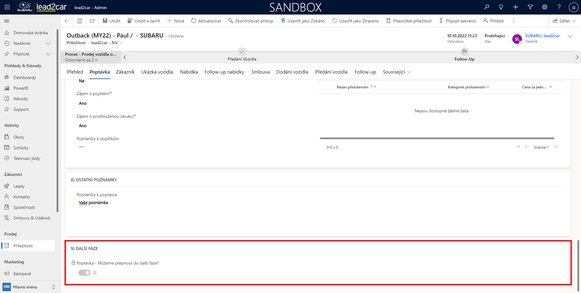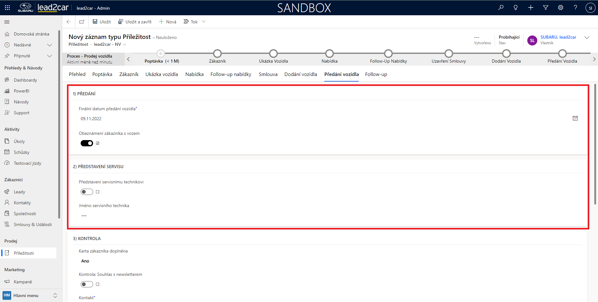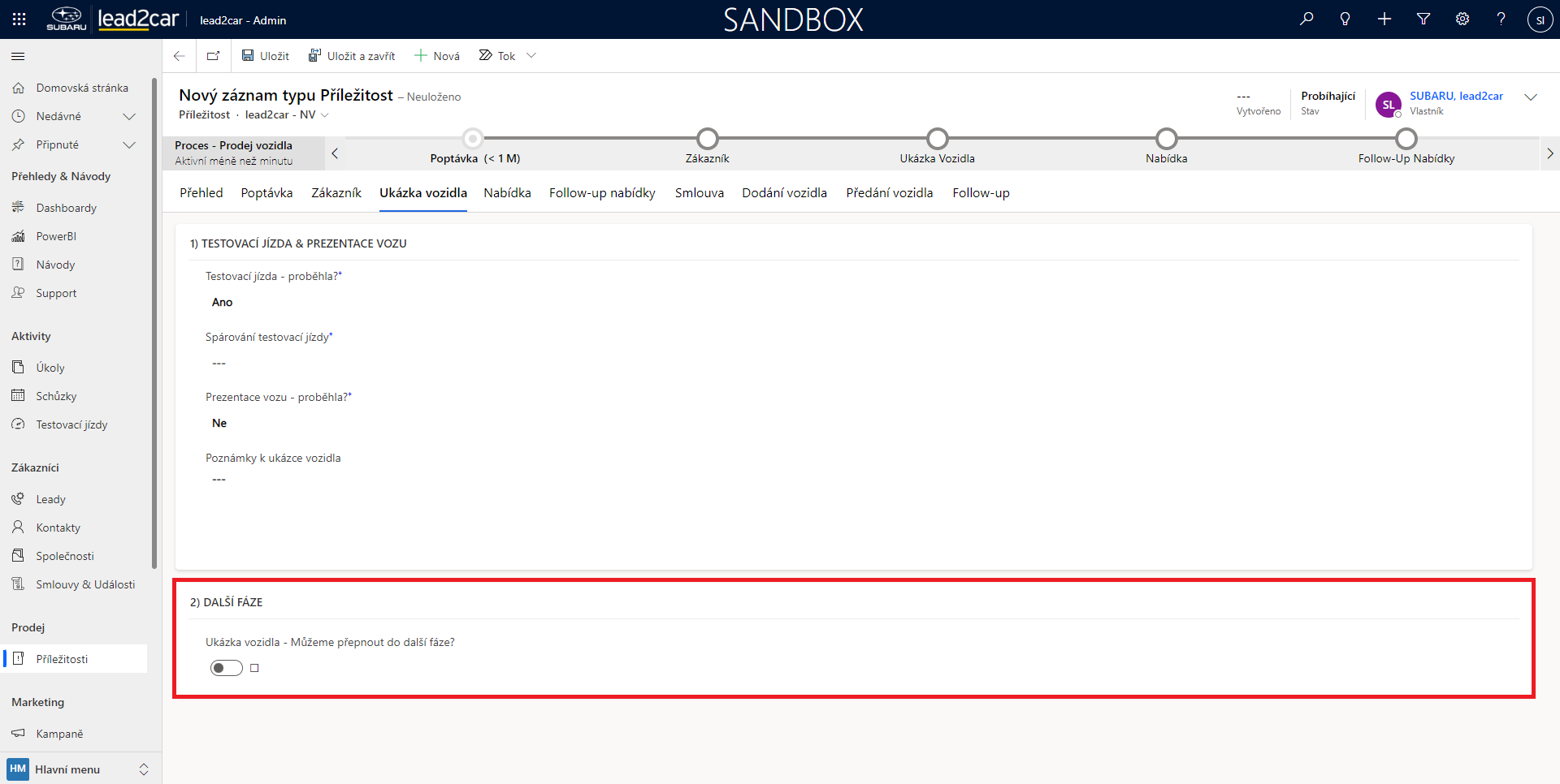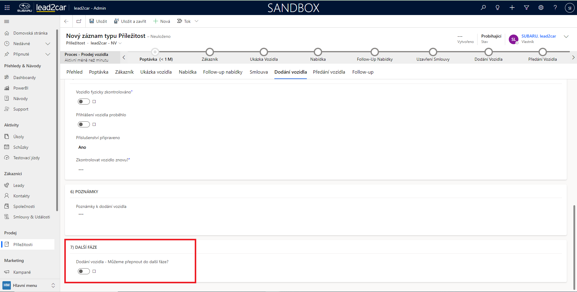 V posledním boxu lze zakliknout "Přepnout do další fáze". Toto pole se odemkne až po uložení záznamu a po jeho zakliknutí budete automaticky přesměrováni na záložku "Dodání vozidla".