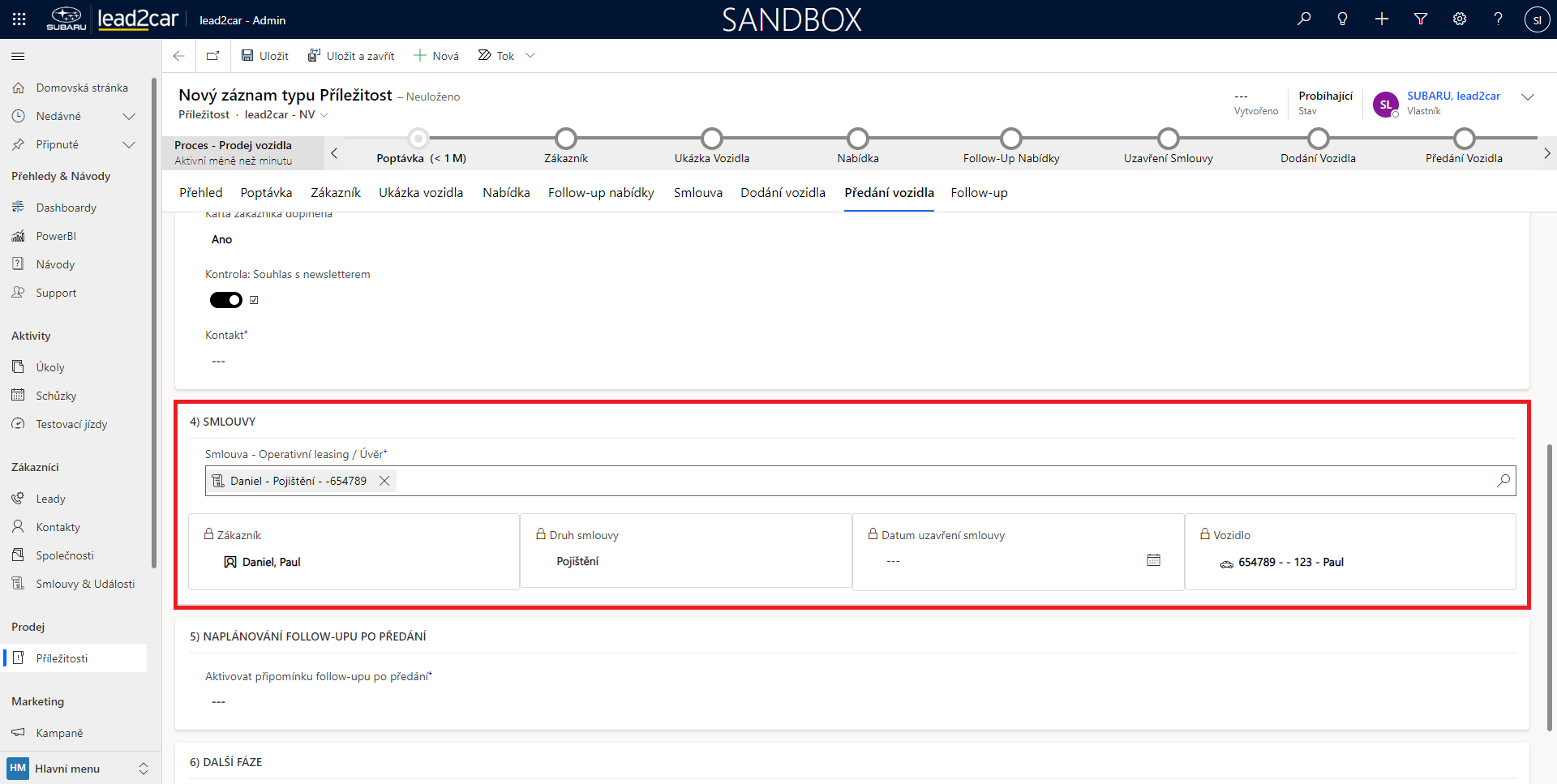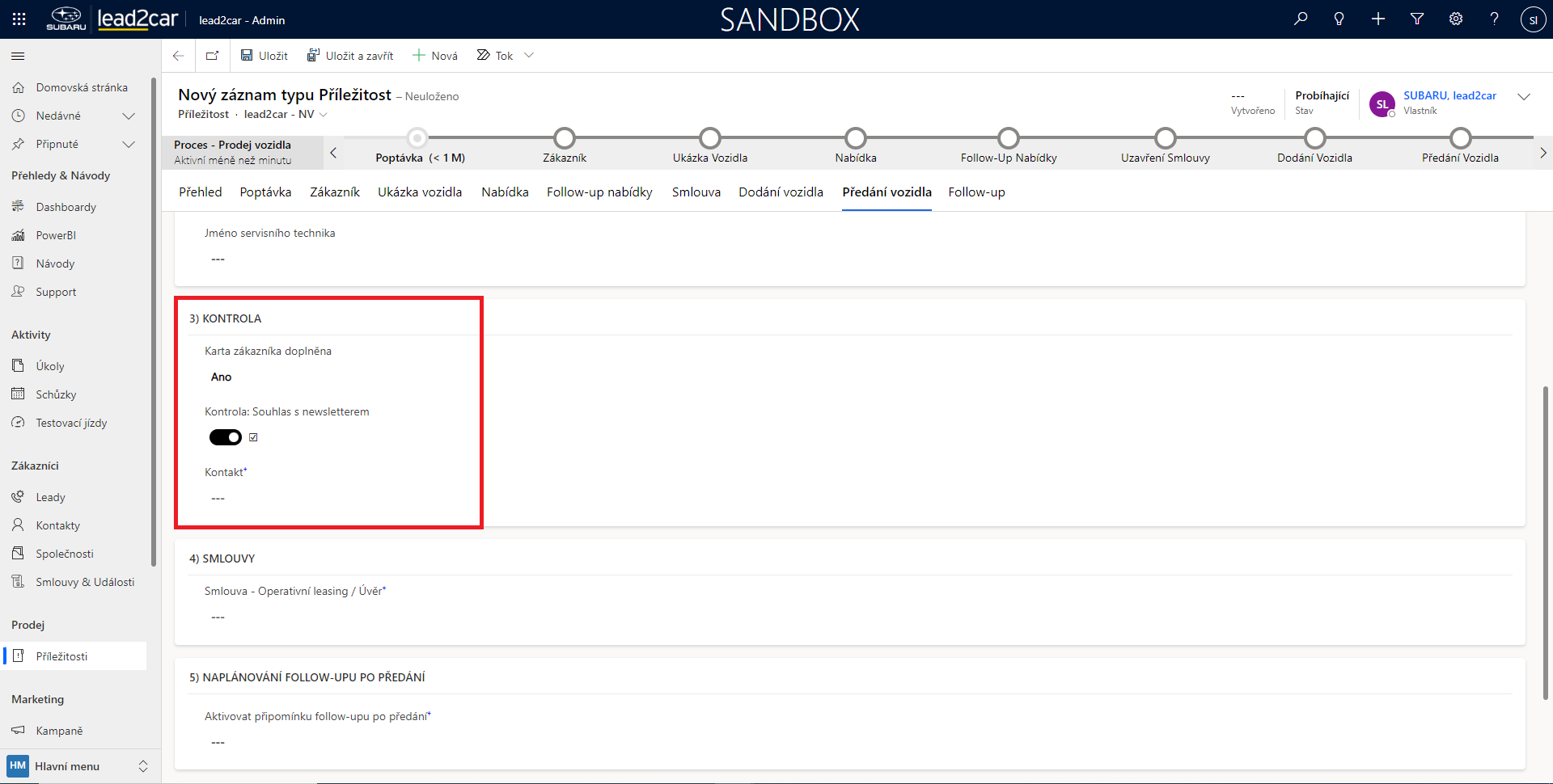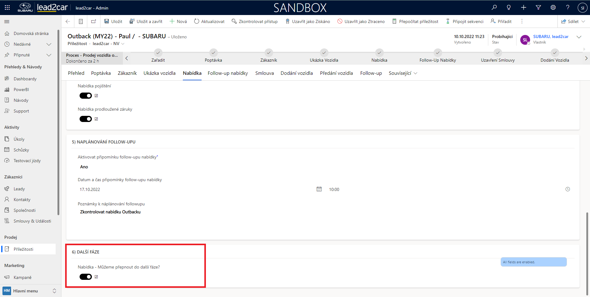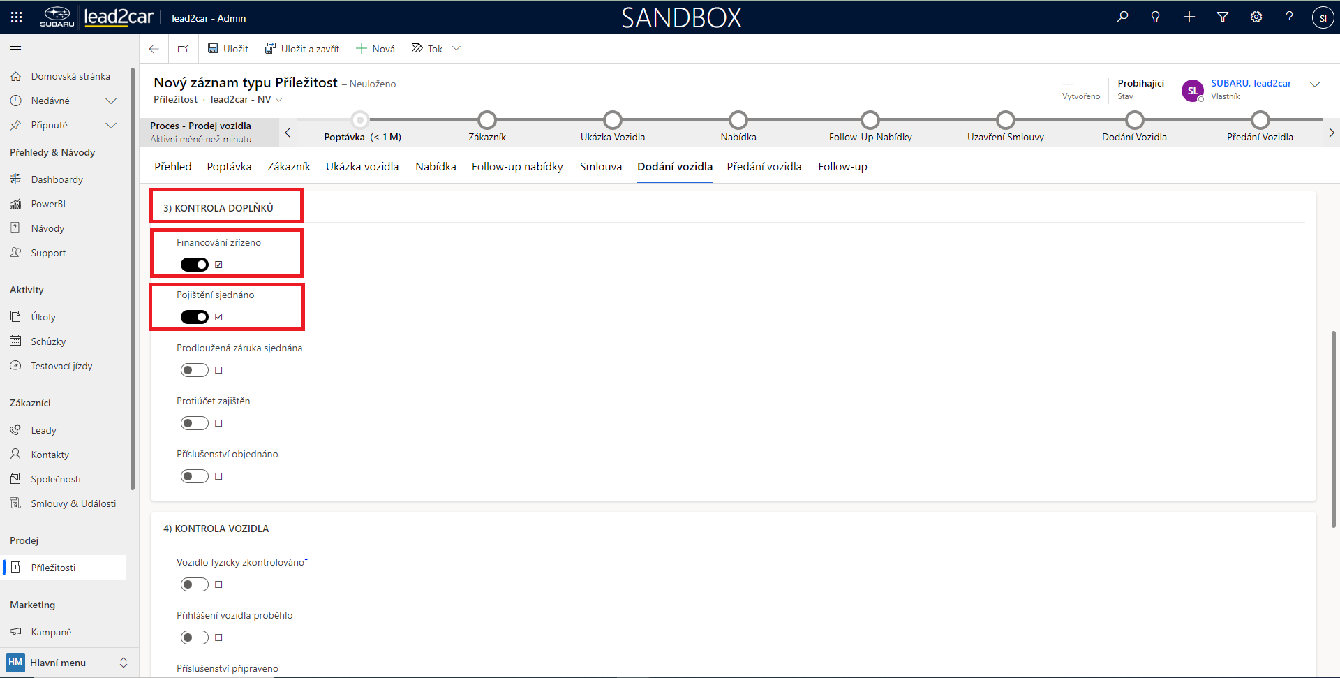 V posledním boxu lze zakliknout "Přepnout do další fáze". Toto pole se odemkne až po uložení záznamu a po jeho zakliknutí budete automaticky přesměrováni na záložku "Dodání vozidla".