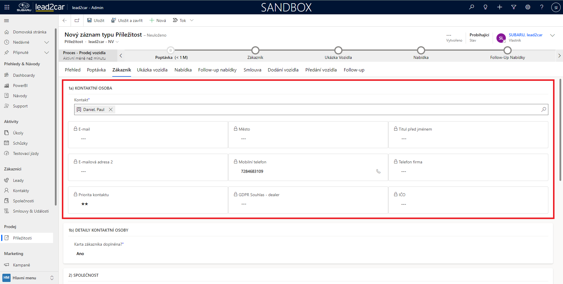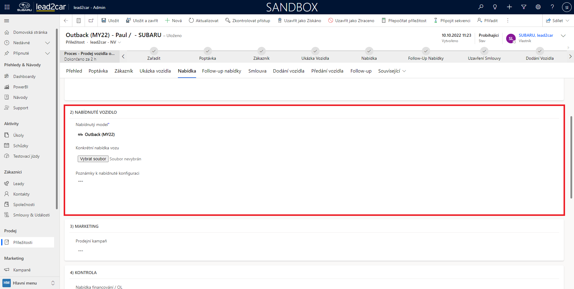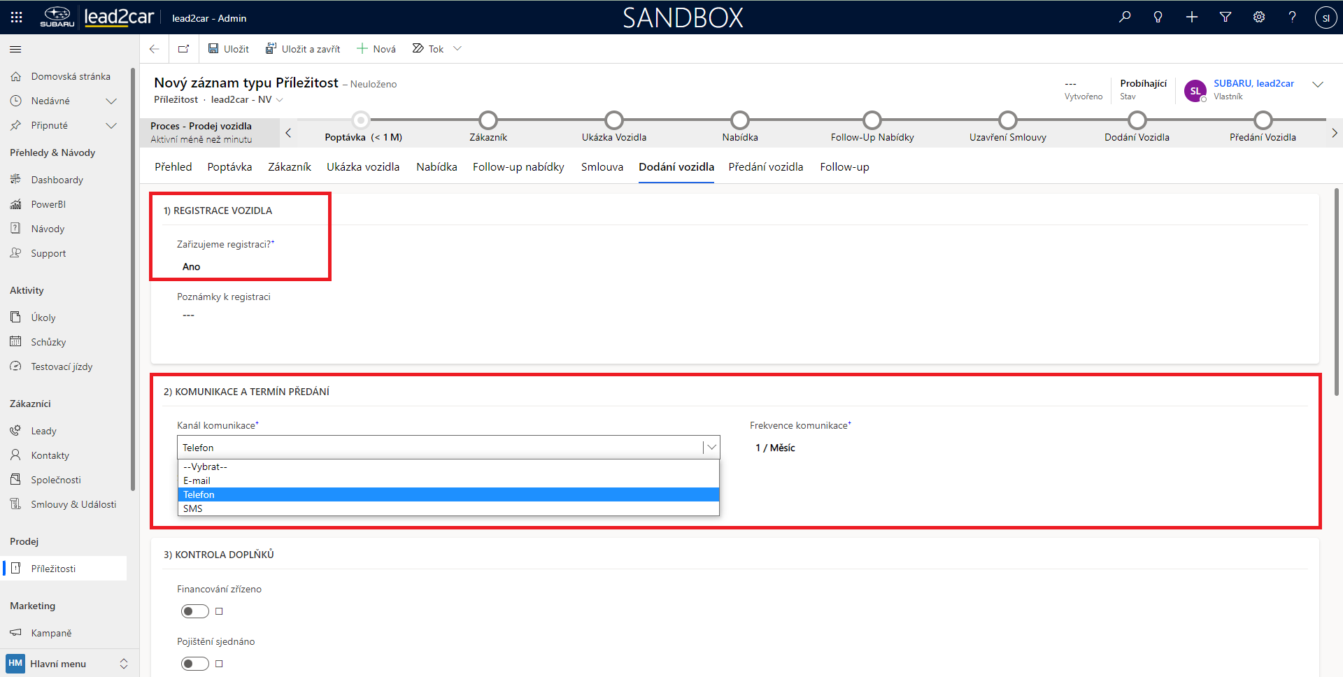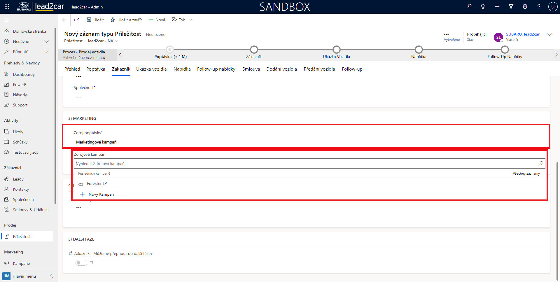 V posledním boxu lze zakliknout "Přepnout do další fáze". Toto pole se odemkne až po uložení záznamu a po jeho zakliknutí budete automaticky přesměrováni na záložku "Dodání vozidla".