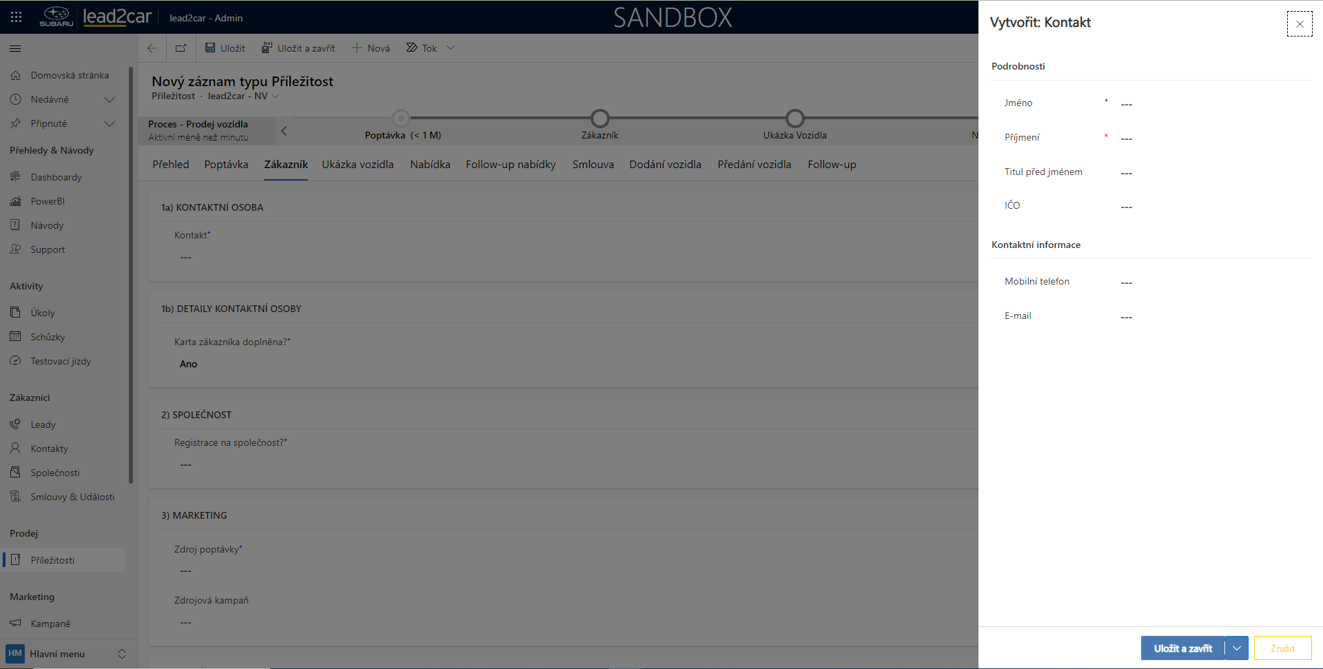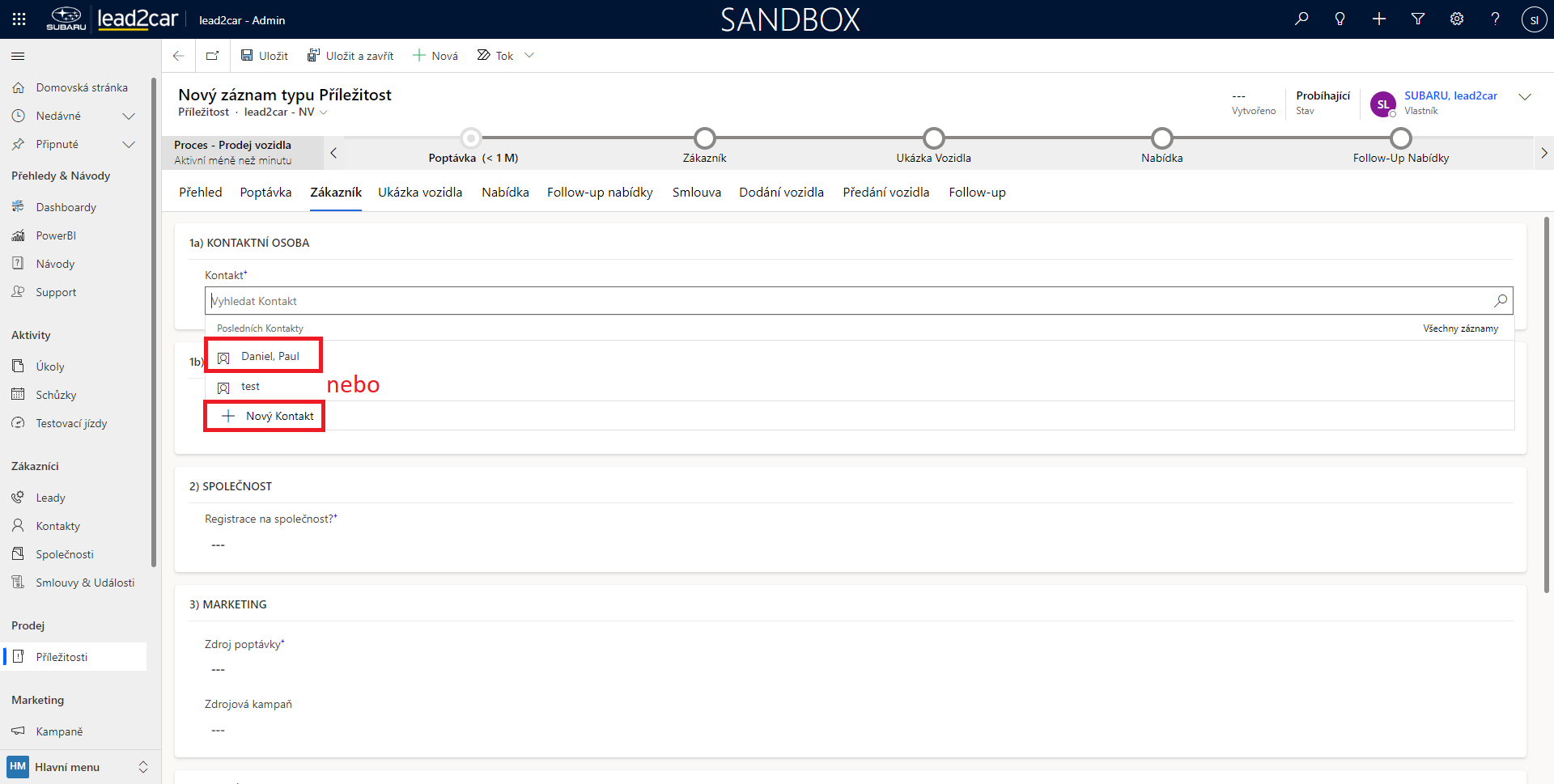 Karta "Ukázka vozidla" slouží k zaznamenání prvního kontaktu zákazníka s vozidlem. Jako první lze označit, jestli se zákazník zúčastnil testovací jízdy. Pokud ano, v poli "Spárování testovací jízdy" můžete vybrat konkrétní testovací jízdu z databáze. Pokud daná jízda v databázi chybí, můžete ji přidat pomocí volby "+ Nový Testovací jízda". Dále lze zaznamenat, jestli proběhla ukázka vozu a zapsat k ukázce vozidla libovolnou poznámku.