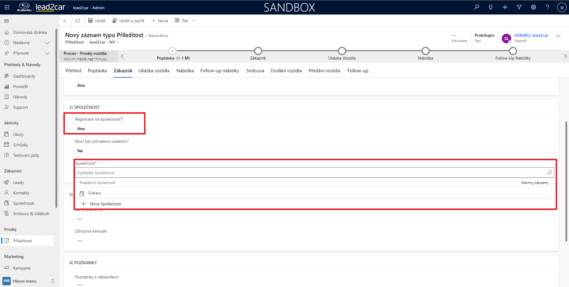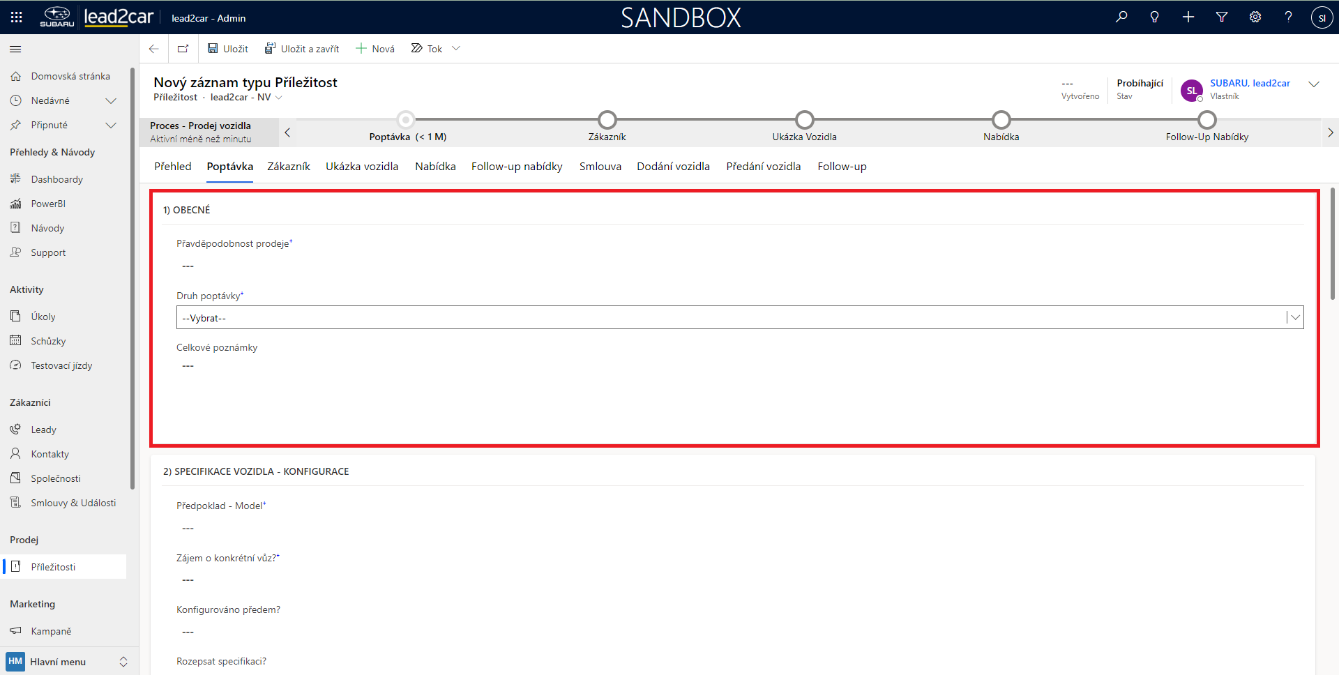 Nejdříve je třeba vyplnit box "Obecné". Na formuláři Příležitosti se mnoho polí objevuje až na základě Vaší volby. Například nyní pokud bude zvolena možnost "Jedná se o velkoodběr" jako "Ano", objeví se pole "Jsou vozidla identická?". Podobných možností je na formuláři Příležitosti mnoho a tento návod se všemi nezabývá, nicméně je třeba pamatovat na to, že při vyplnění některých polí se objeví pole nová, která je třeba také vyplnit.