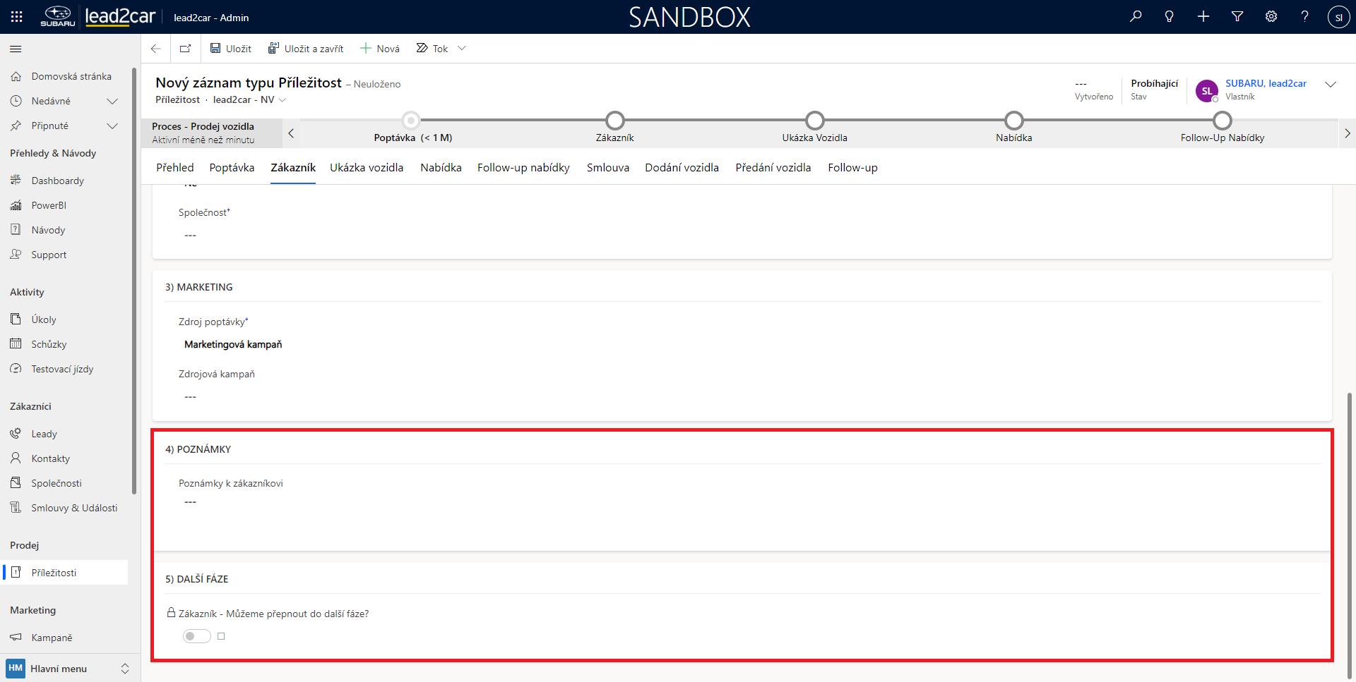 Nakonec je zde možnost přidat jakoukoliv poznámku. V posledním boxu lze zakliknout "Přepnout do další fáze". Toto pole se odemkne až po uložení záznamu a po jeho zakliknutí budete automaticky přesměrování na záložku "Zákazník".