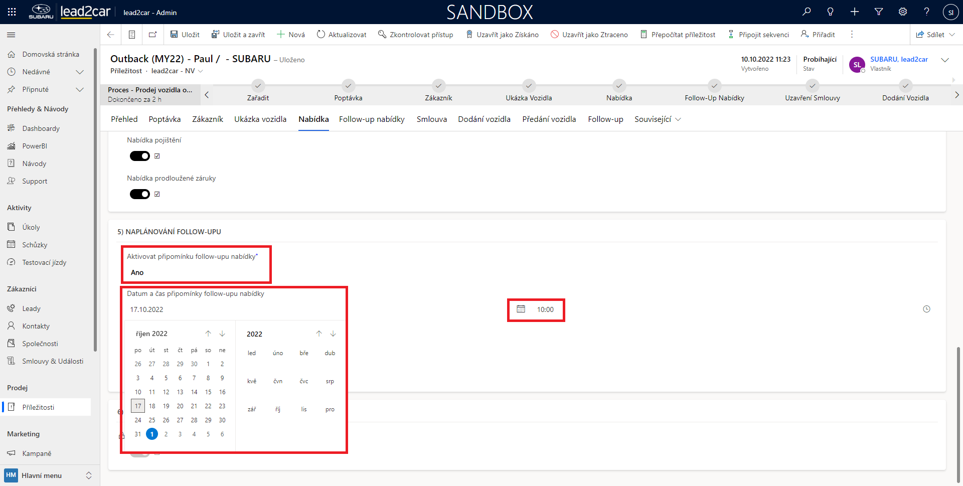 V posledním boxu je možné zakliknout "Přepnout do další fáze". Toto pole se odemkne až po uložení záznamu a po jeho zakliknutí budete automaticky přesměrováni na záložku "Follow-up nabídky".