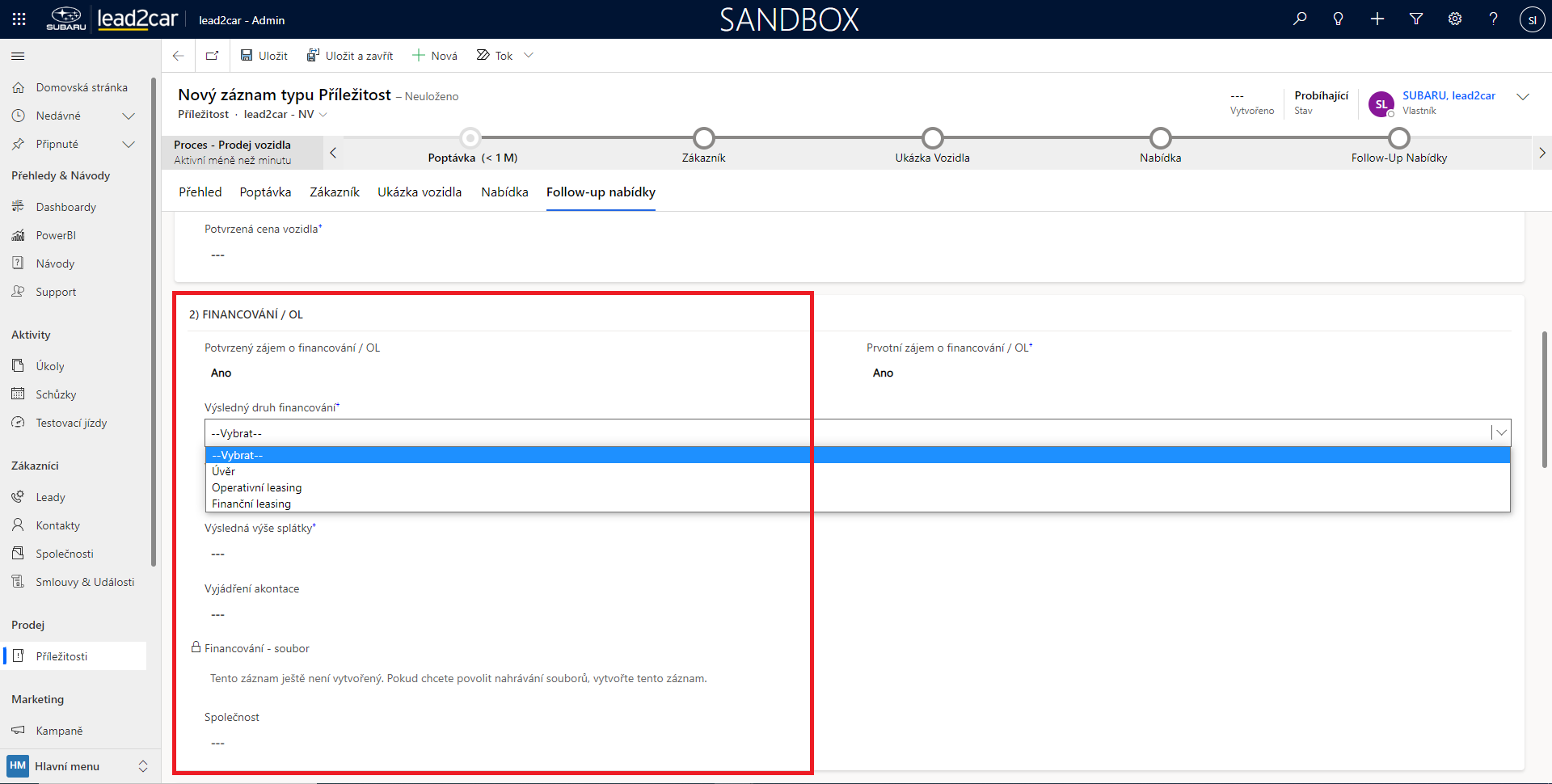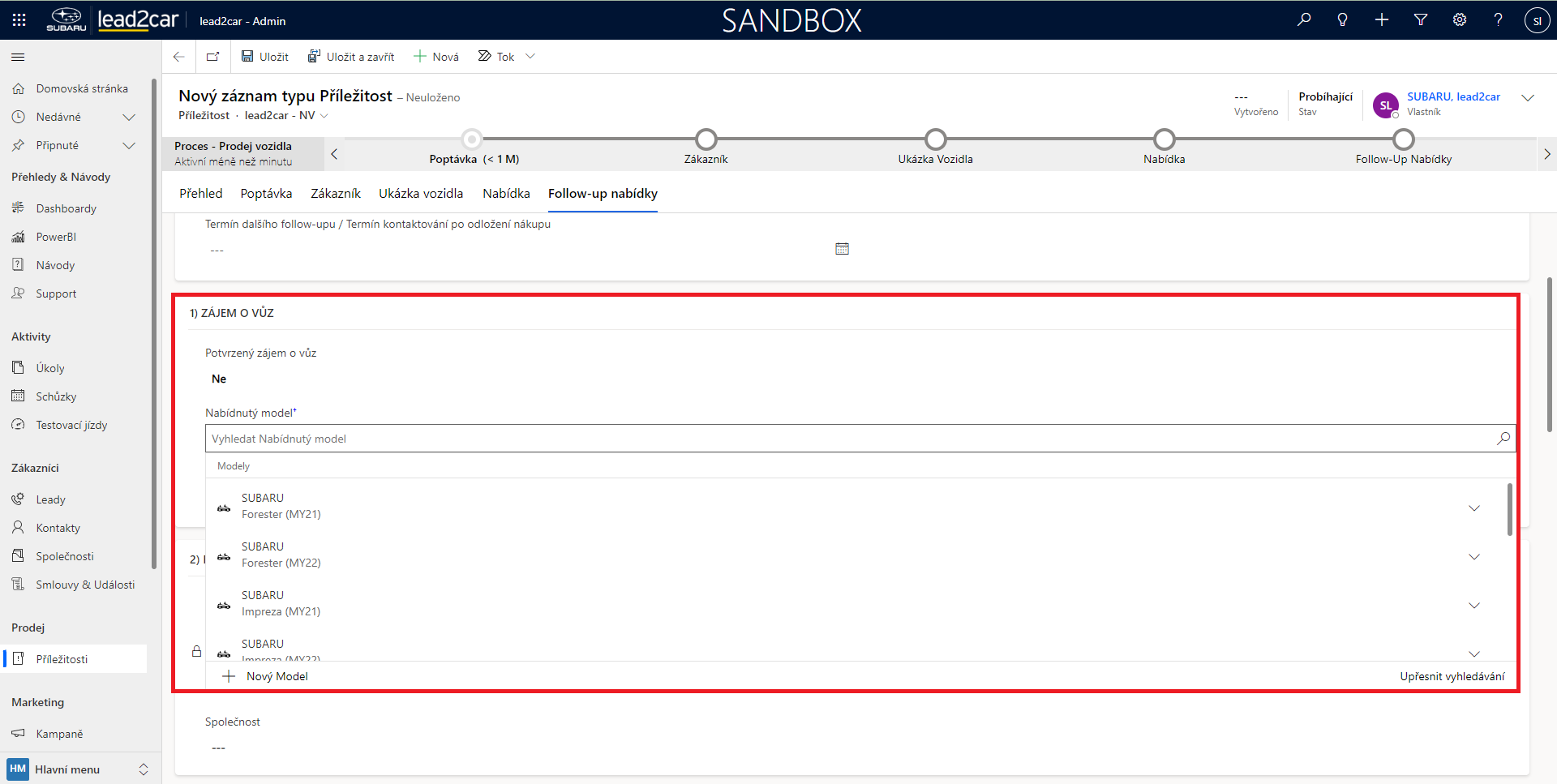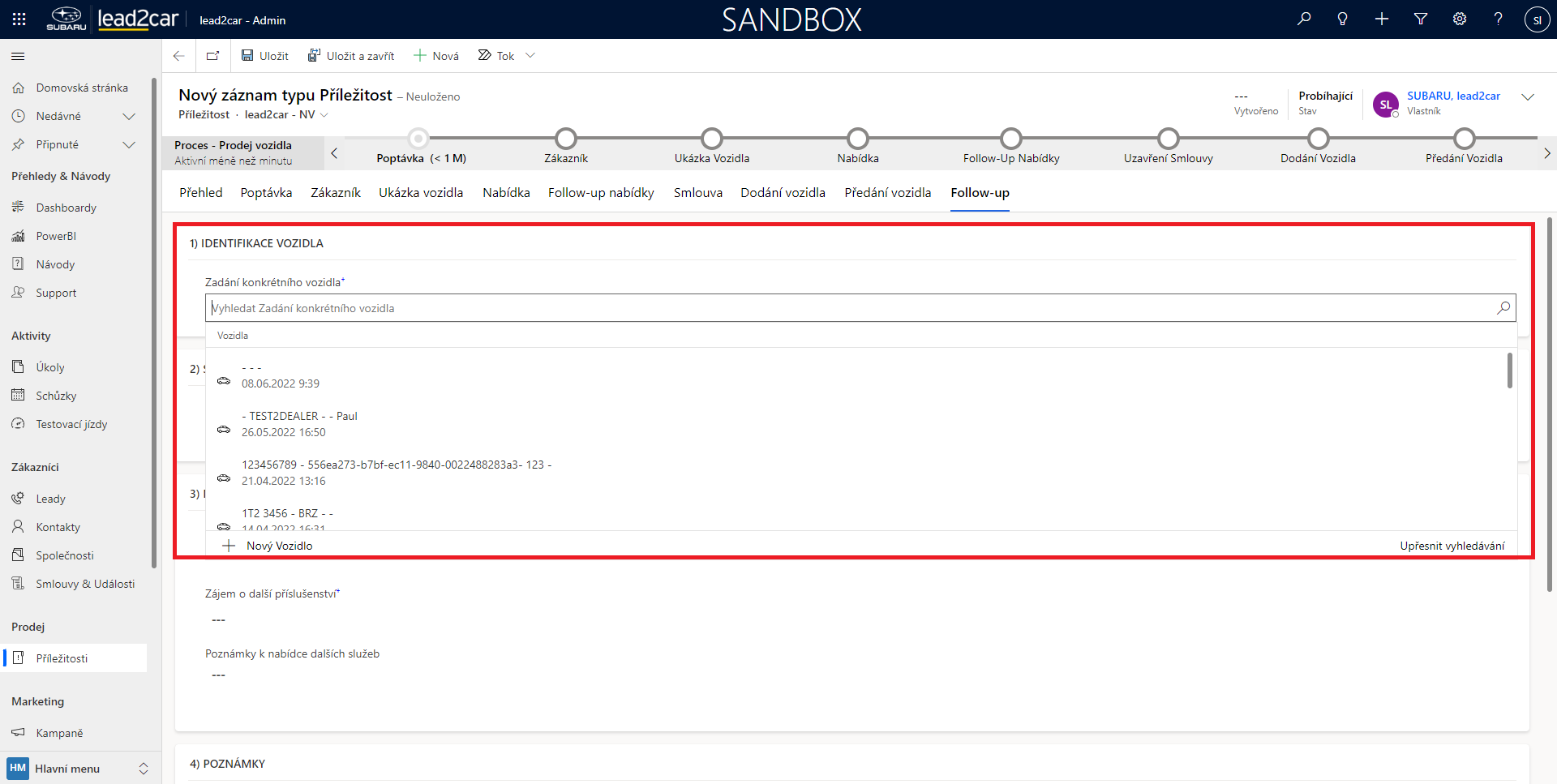 V poli identifikace vozidla vyberte konkrétní vozidlo týkající se příležitosti z databáze vozidel. Pokud v databázi vozidlo není, lze ho přidat pomocí volby "+ Nové Vozidlo". Po výběru vozidla se zobrazí detaily vozidla. Lze zde také přidat odhadovanou délku vlastnictví vozidla v měsících.
