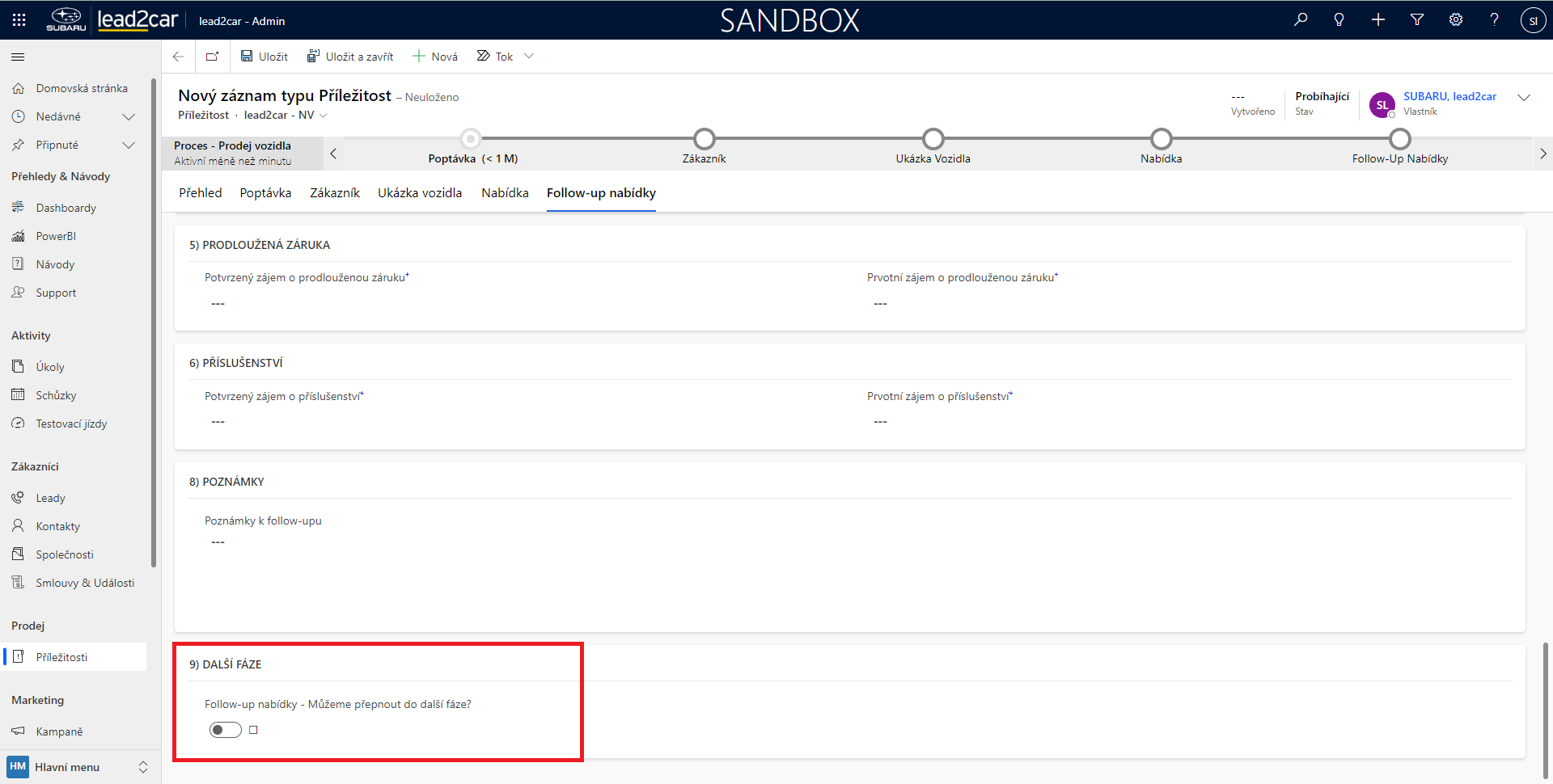 V posledním boxu lze zakliknout "Přepnout do další fáze". Toto pole se odemkne až po uložení záznamu a po jeho zakliknutí budete automaticky přesměrováni na záložku "Follow-up".