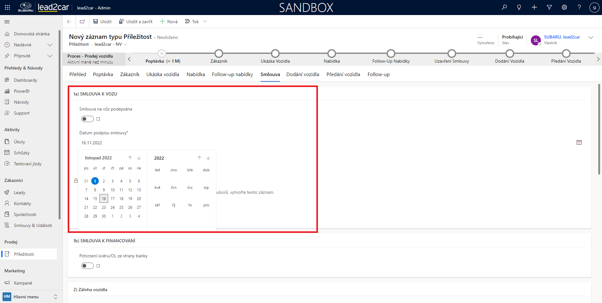 Na kartě "Smlouva" jsou evidovány detaily podpisu smlouvy. Také zde lze zaznamenat detaily termínu předání vozidla, který vyberte z nabídnutého kalendáře. K předání je možné přidat i vlastní poznámku.