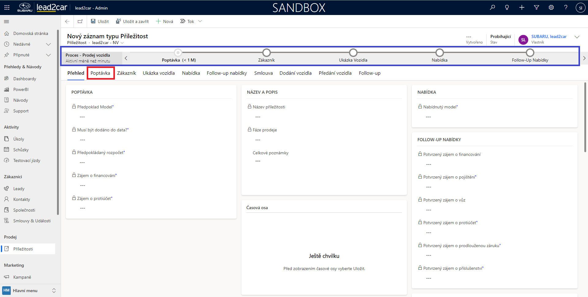 Nyní se otevře formulář nové příležitosti pro NV. Nahoře je znázorněn obchodní proces (modrý) a pod ním jsou jednotlivé záložky. Formulář se automaticky otevře na záložce "Přehled". Tato záložka slouží k rychlému zorientování se v Příležitosti, nicméně při vyplňování formuláře je třeba začít nejprve s kartou Poptávka (červeně).