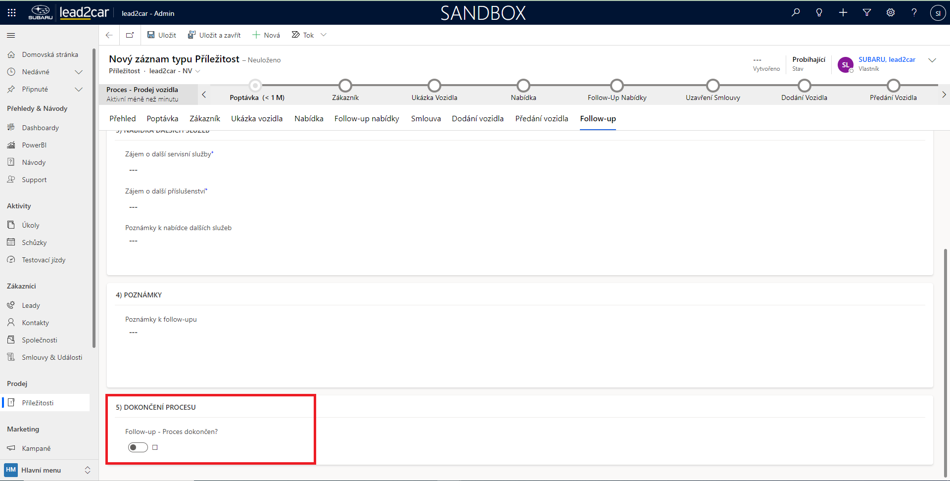 V posledním boxu lze zakliknout "Proces dokončen". Toto pole se odemkne až po uložení záznamu a po jeho zakliknutí bude příležitost přeřazena mezi uzavřené příležitosti.